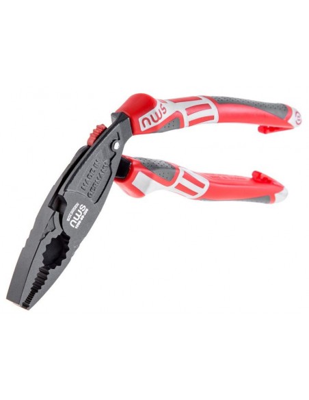 Alicate multifunción con cabeza acodada diseñada específicamente para las necesidades de los profesionales, para cortar alambres duros y blandos. Dispone de superficies prensoras asimétricas para mejor apoyo en la pieza, zonas de agarre para material plano y redondo, llave de estrella integrada, articulación con transmisión de palanca óptima para un trabajo sencillo y sin esfuerzos, resorte de apertura y dispositivo cerrador, mangos ergonómicos de 2 componentes SoftGripp antideslizantes color rojo/gris, y cabeza teflonada color titanio. Esta herramienta es garantía de seguridad, uso fácil y eficiencia con el mínimo esfuerzo ya que su diseño ergonómico asegura un trabajo cómodo y reduce la tensión en ligamentos y articulaciones.