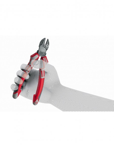 Alicate corte diagonal modelo sueco para alambres duros y blandos con cuchillas de precisión para alambres finos, articulación con transmisión de palanca óptima para un trabajo sencillo y sin esfuerzos, mangos ergonómicos de 2 componentes SoftGripp antideslizantes color rojo/gris, y cabeza teflonada color titanio.