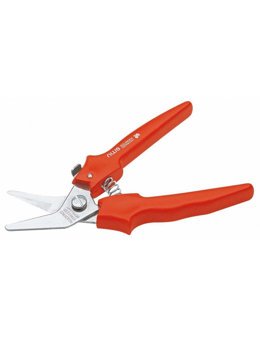 Hojas de acero inoxidable, filo dentado. Muelle de abertura automático con seguro de cierre. Mangos de plástico resistente a impactos. Apta para alambre no templado, plástico, madera, cartón, piel.