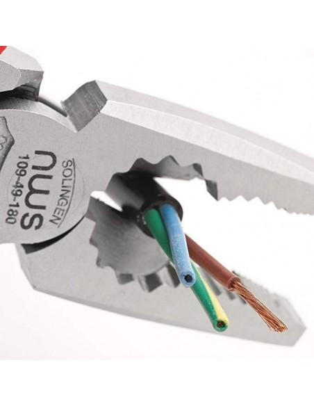 · Alicate universal multifunción. · Patrón americano. · Para trabajos de sujeción, agarre, doblado y corte. · Para cortar alambres duros y blandos. · Filos de corte templados por inducción. · Con ranura para sujetar clavos y alambre. · Zonas de agarre para materiales planos y redondos. · Bocas internas asimétricas para un mejor agarre de la pieza de trabajo. · Llave de estrella integrada. · Transmisión de potencia con acción de palanca óptima para un trabajo fácil y sin esfuerzo. · Mangos VDE, ergonómicos y antideslizantes SoftGripp de 2 componentes según DIN EN / IEC 60900. · Fabricado en acero especial para herramientas, forjado, endurecido al aceite. · Acabado de la cabeza cromado mate.