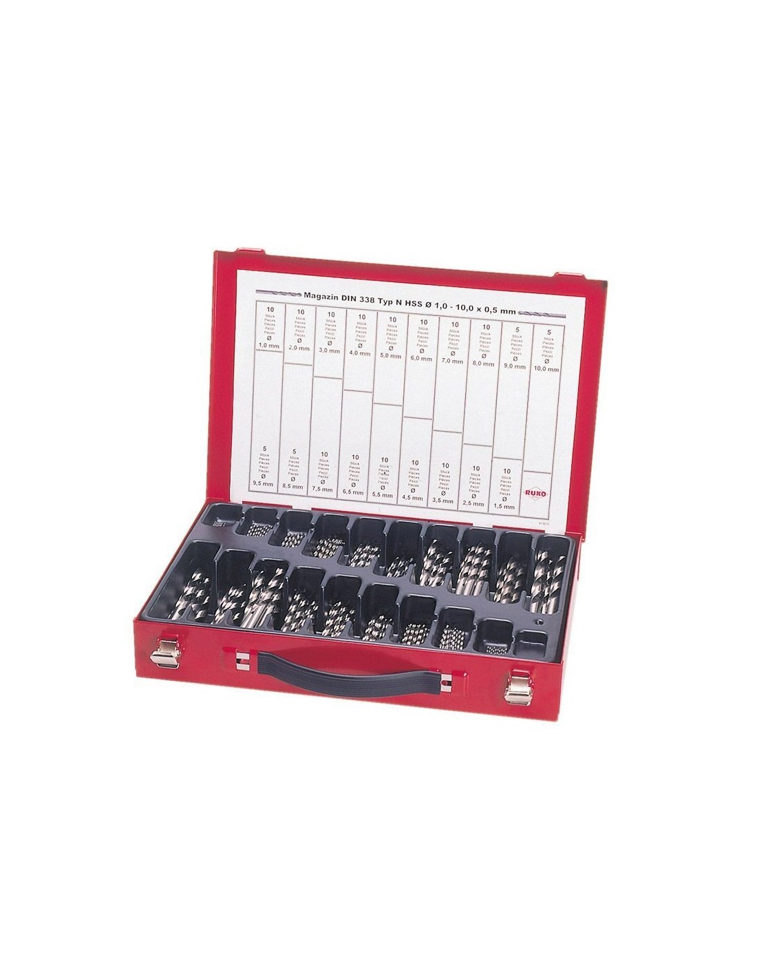 | 214200 | 170 brocas | 10 pzas. 1-8 x 0,5 mm + 5 pzas. 8,5 -10 x 0,5 mm |