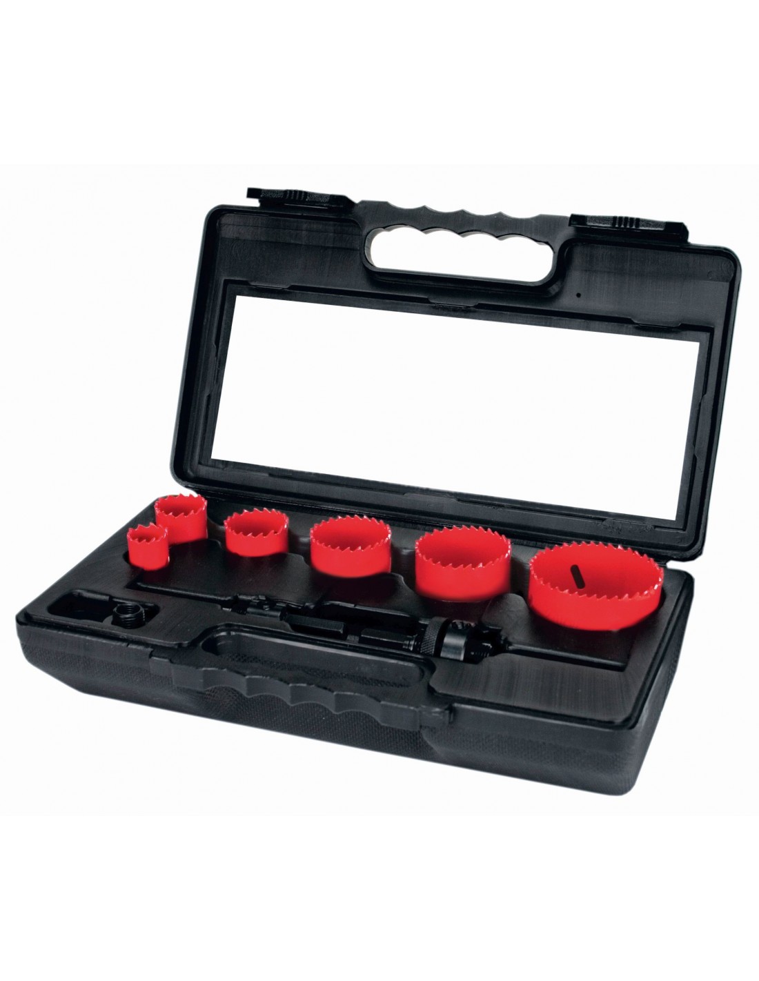 HSS bimetal dentado variable, color rojo. Estuche plástico. Contenido: 1 corona de cada 22,0 - 29,0 - 35,0 - 44,0 - 51,0 - 68,0 mm 1 soporte de cada A4 - A2