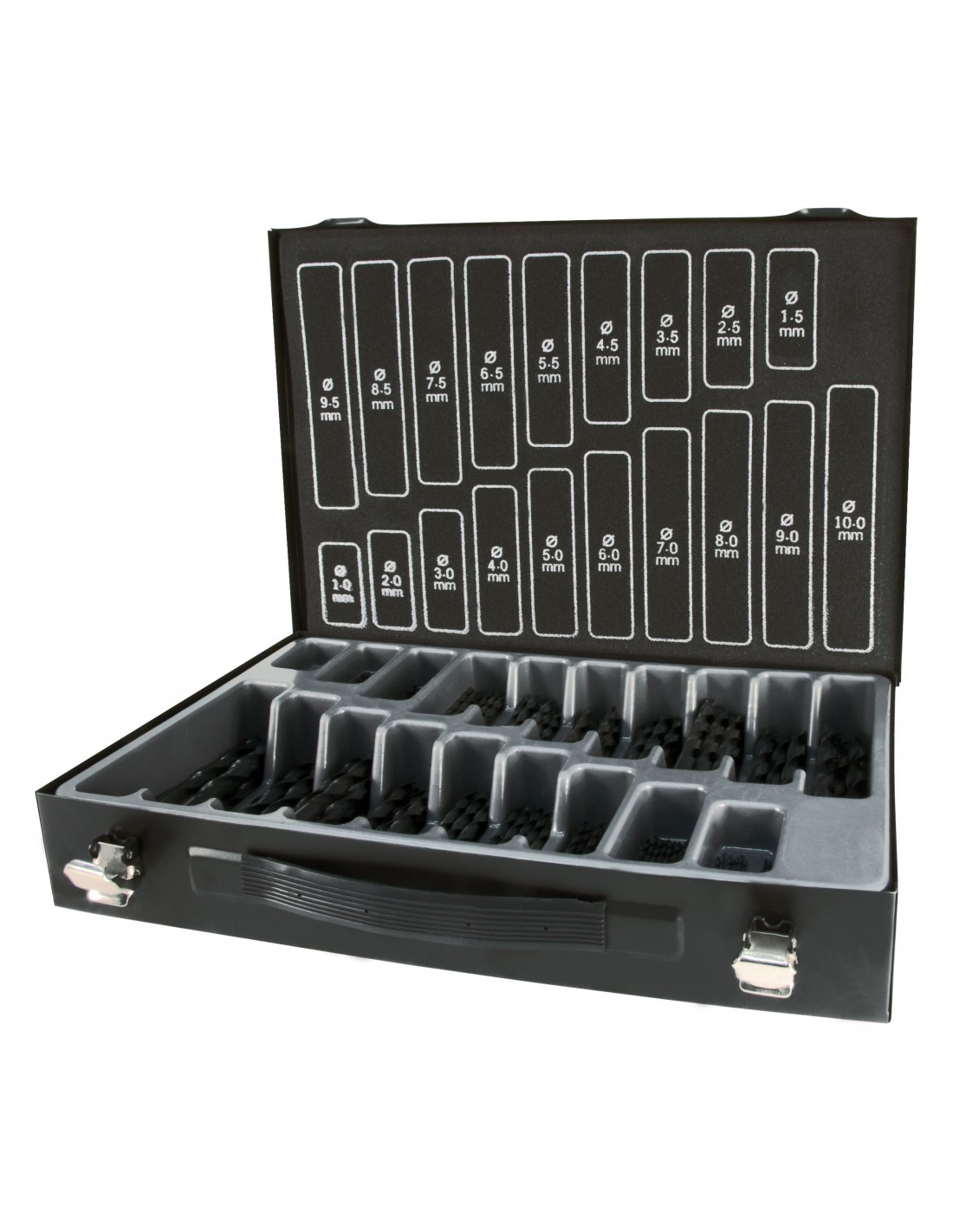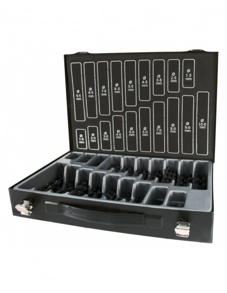 Estuche metálico Contenido: 10 piezas cada 1,0 a 8,0 mm en incrementos de 0,5 mm 5 piezas cada 8,5 a 10,0 mm en incrementos de 0,5 mm