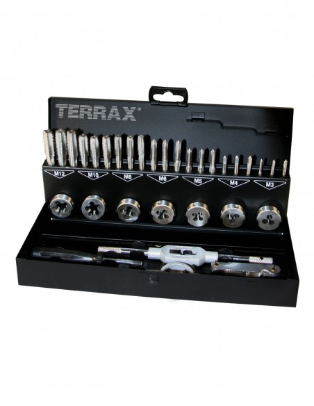 Estuche metálico Contenido: Machos mano M DIN 352 rectificados 3 piezas de cada: M3 - M4 - M5 - M6 - M8 - M10 - M12 Cojinetes redondos rectificados 1 pieza de cada: M3 - M4 - M5 - M6 - M8 - M10 - M12 1 giramachos Nº 1 1/2 1 porta cojinetes 25 x 9 mm 1 destornillador