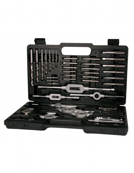 Estuche metálico Contenido: Machos mano M DIN 352 rectificados 3 piezas de cada: M3 - M4 - M5 - M6 - M8 - M10 - M12 Cojinetes redondos rectificados 1 pieza de cada: M3 - M4 - M5 - M6 - M8 - M10 - M12 1 porta cojinetes de cada 20x5 - 20x7 - 25x9 - 30x11 - 38x14 mm 1 giramachos de cada Nº 1 - Nº 2 1 destornillador 1 juego patrones rosca 7 brocas DIN 338 HSS laminadas 1 giramachos con carraca Nº 1