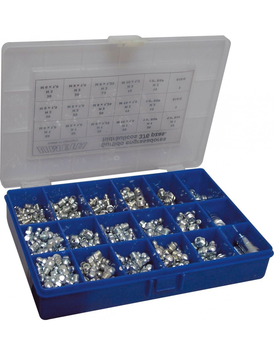| 6037140 | SORT-376 | H1-M6 (50 Uds.), H1-M8x1,0 (30 Uds.), H1-M8X1,25(30 Uds.), H1-M10X1,0 (30 Uds.), H1-R 1/8" (20 Uds.), H1-R1/4" (10 Uds.), H2-M6 (30 Uds.), H2-M8X1,0 (20 Uds.), H2-M8X1,25 (20 Uds.), H2-M10X1,0 (15 Uds.), H2-R 1/8" (15 Uds.), H3-M6 ( 30 Uds.), H3-M8X1,0 (20 Uds.), H3-M8X1,25 (20 Uds.), H3-M10X1,0 (15 Uds.), H3-1/8" (15 Uds.), 516/G-1/8" (6 Uds.) |