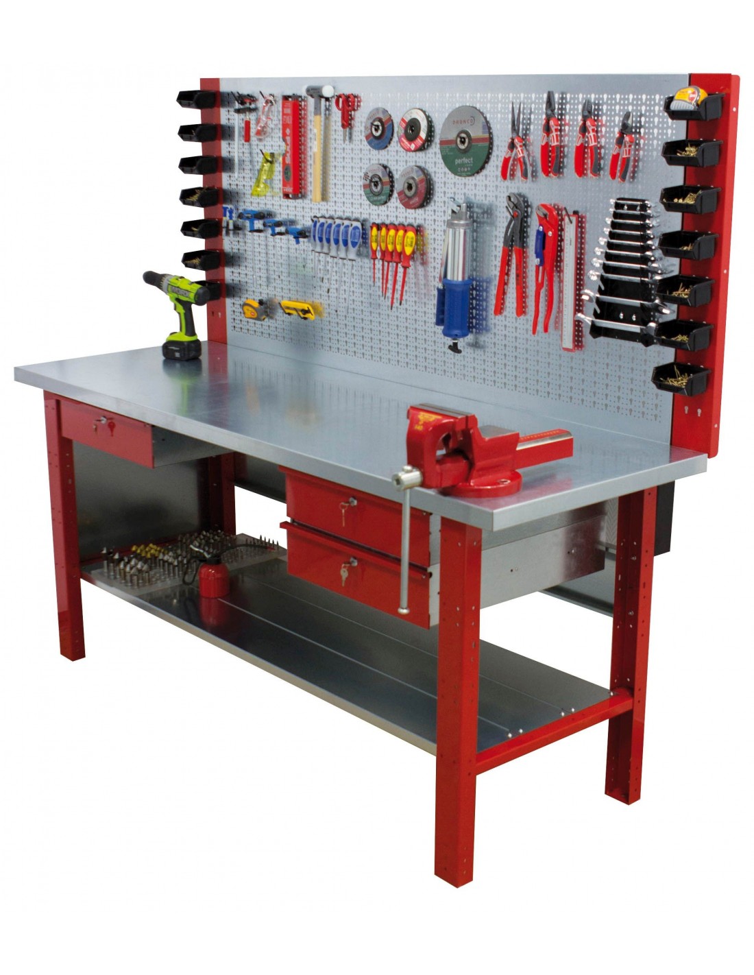 Colocado mediante barras soporte posteriores permiten situar el banco de trabajo en cualquier lugar sin necesidad de ser apoyado en la pared.