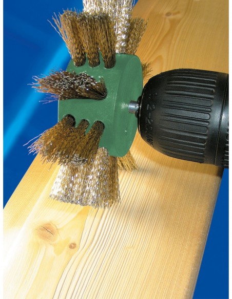 · Encerar, trabajos en madera, decapar, eliminar herrumbre, desbarbar, desincrustar, pulir, limpiar. · Los cepillos con filamentos abrasivos son adecuados para el tratamiento de la madera. Los cepillos con filamentos de fibra son adecuados para pulir. El cuerpo de plástico reduce el peso.