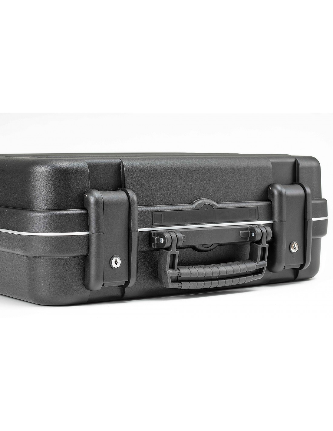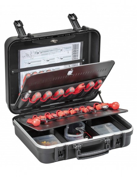 · Perfil de aluminio - asa cromada con grip de goma - cerradura central con llave - 1 compartimento para documentos - 2 paneles portaherramientas - compartimento inferior - 2 cajitas para pequeños objetos.