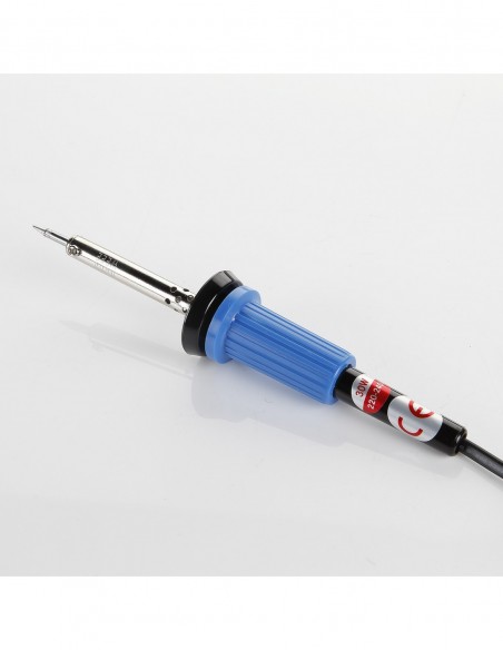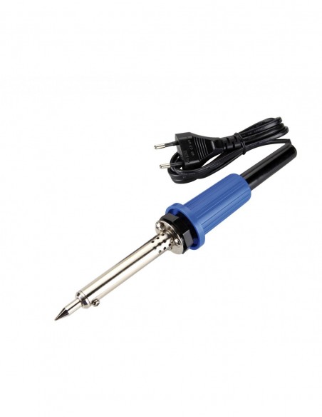 Soldador de fuente eléctrica con resistencia que calienta la punta en Acero con protección superficial niquelada. La fuente de alimentación es un enchufe para corriente eléctrica de 230V AC. El soldador esta fabricado según normas de protección eléctrica CE. Es posible el suministro de puntas de recambio y bomba de succión desoldadora. Rápido calentamiento gracias a su resistencia interna para soldaduras electrónicas de estaño. Ideal para uso profesional o doméstico, suelda rápidamente con estaño todo tipo de cables eléctricos o componentes electrónicos. El mango es antitérmico, gracias a su protección en plástico, lo que evita que se caliente a pesar de estar en pleno funcionamiento y ergonómico para un mayor confort en usos prolongados.