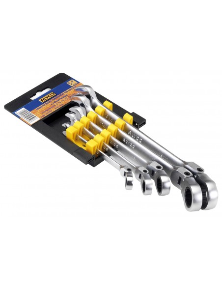 Juego de 5 llaves de boca abierta y boca estrella con carraca reversible flexible articulada en soporte plástico. Este soporte colgable de apertura con seguro y posibilidad de apertura y exposición. Este soporte facilita la localización de las llaves, su identificación en caso de falta, y la organización en el taller.