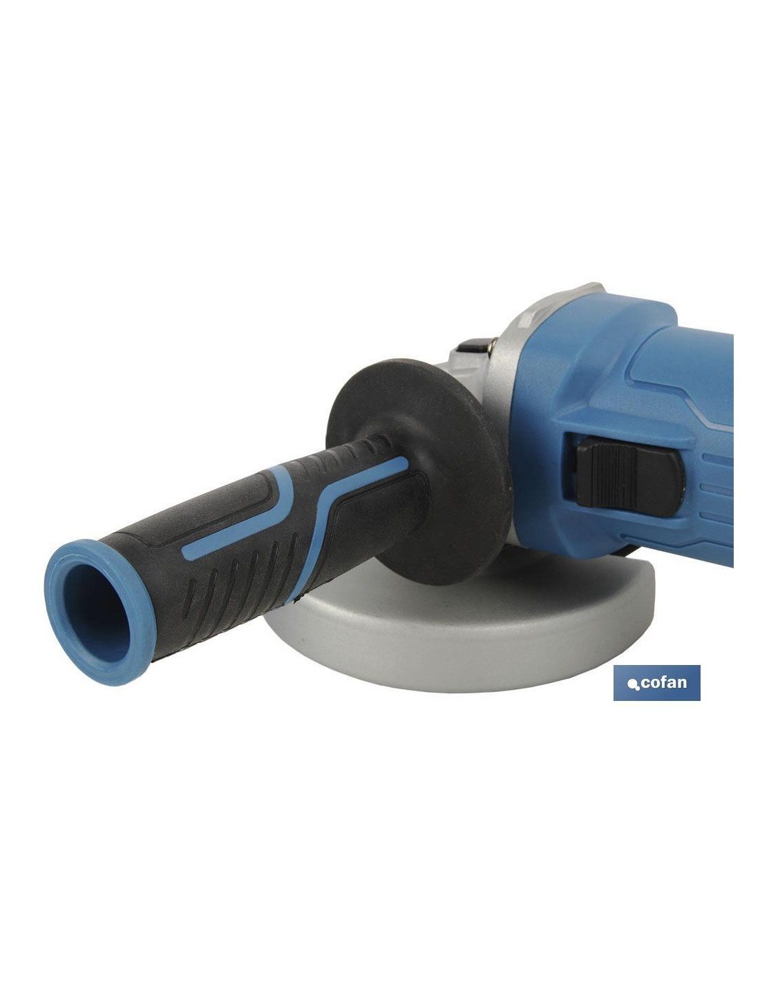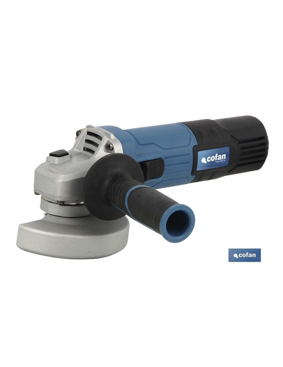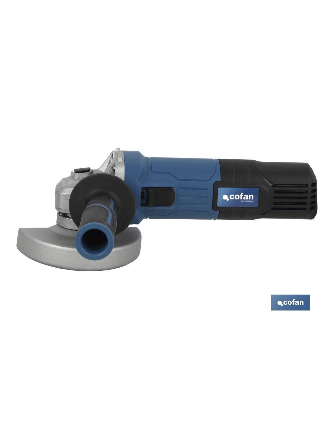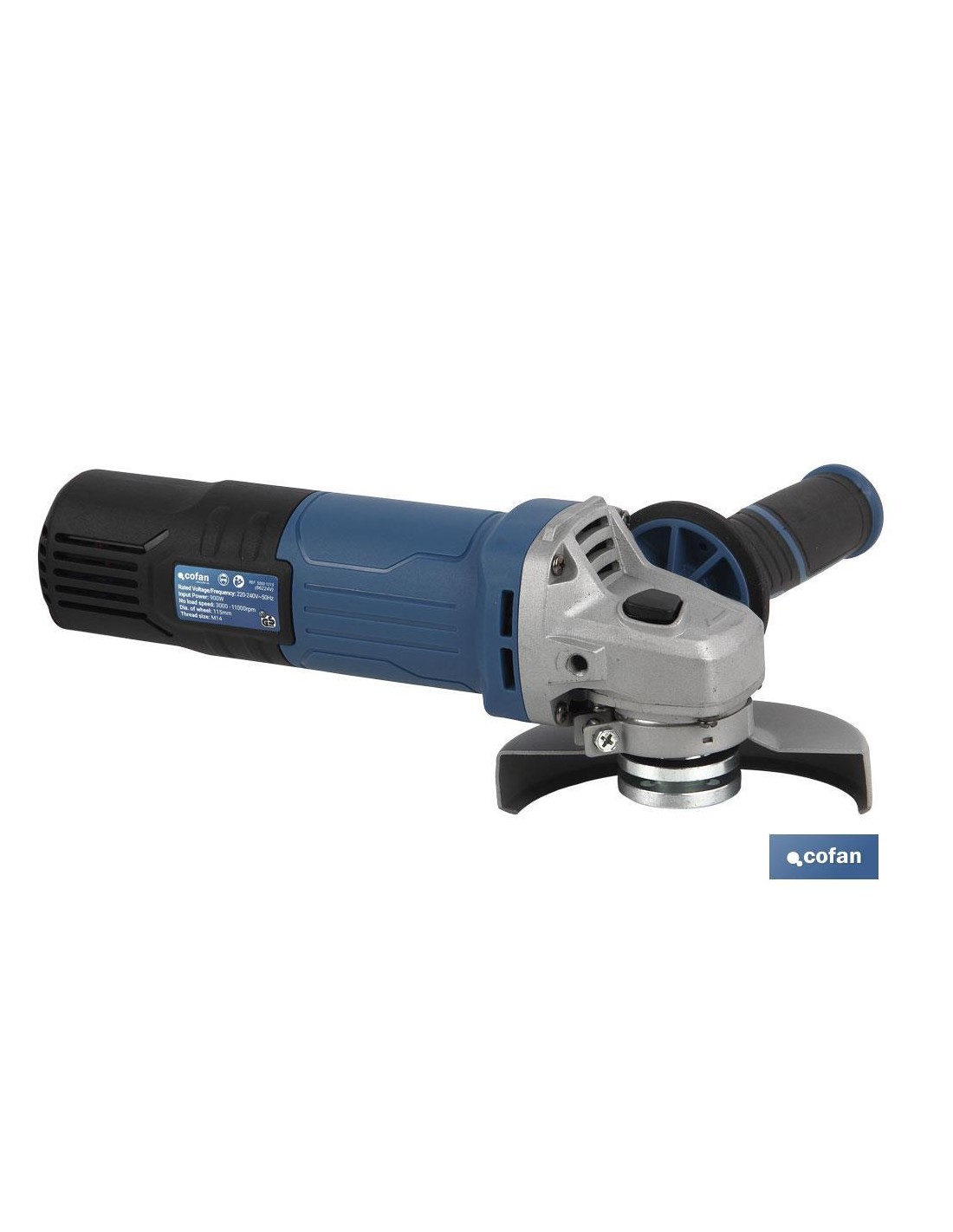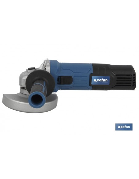 Amoladora angular de 900 W con velocidad variable para discos de Ø115/125 mm, con interruptor hombre muerto, empuñadura lateral antivibración, escobillas de desconexión automática, tuerca antibloqueo, variador de velocidad, sistema cambio rápido disco. Nº REI-RAEE de Cofan La Mancha: 7038.
