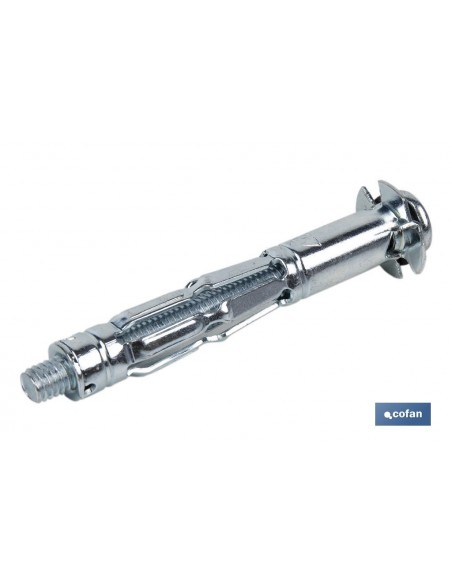Anclaje metálico con tornillo de cabeza redonda para fijación en elementos huecos. Este tipo de anclajes se utilizan para fijar los elementos huecos como ladrillo hueco, paneles de yeso, tabique seco, panel de escayola, etc. Máxima carga sobre materiales base de pared delgada gracias a su diseño. Incluye un tornillo con huella PH de colocación fácil, rápida y controlada.Es necesario realizar una instalación previa sobre el material que fijar. Después de la instalación, el tornillo puede ser sustituido por otro de la misma métrica. Requiere de pistola o pinza de colocación con referencias 07900998 o 07900999. Medidas desde M4 hasta M6 y longitudes desde 41 mm hasta 89 mm. Hueco máximo de 22 hasta 78 mm y diámetro de 8 a 12 mm.
