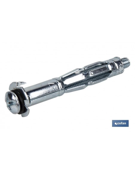 Anclaje metálico con tornillo de cabeza redonda para fijación en elementos huecos. Este tipo de anclajes se utilizan para fijar los elementos huecos como ladrillo hueco, paneles de yeso, tabique seco, panel de escayola, etc. Máxima carga sobre materiales base de pared delgada gracias a su diseño. Incluye un tornillo con huella PH de colocación fácil, rápida y controlada.Es necesario realizar una instalación previa sobre el material que fijar. Después de la instalación, el tornillo puede ser sustituido por otro de la misma métrica. Requiere de pistola o pinza de colocación con referencias 07900998 o 07900999. Medidas desde M4 hasta M6 y longitudes desde 41 mm hasta 89 mm. Hueco máximo de 22 hasta 78 mm y diámetro de 8 a 12 mm.