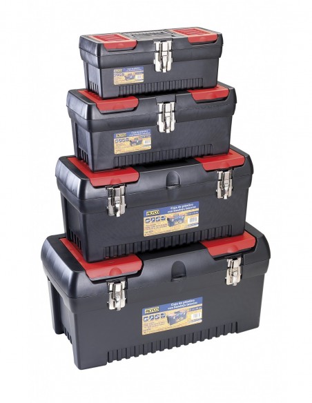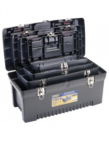 Caja de plástico con bandeja interior y compartimentos para piezas pequeñas en la tapa. Cierres metálicos con orificio para colocar candado y asa integrada extraible.
