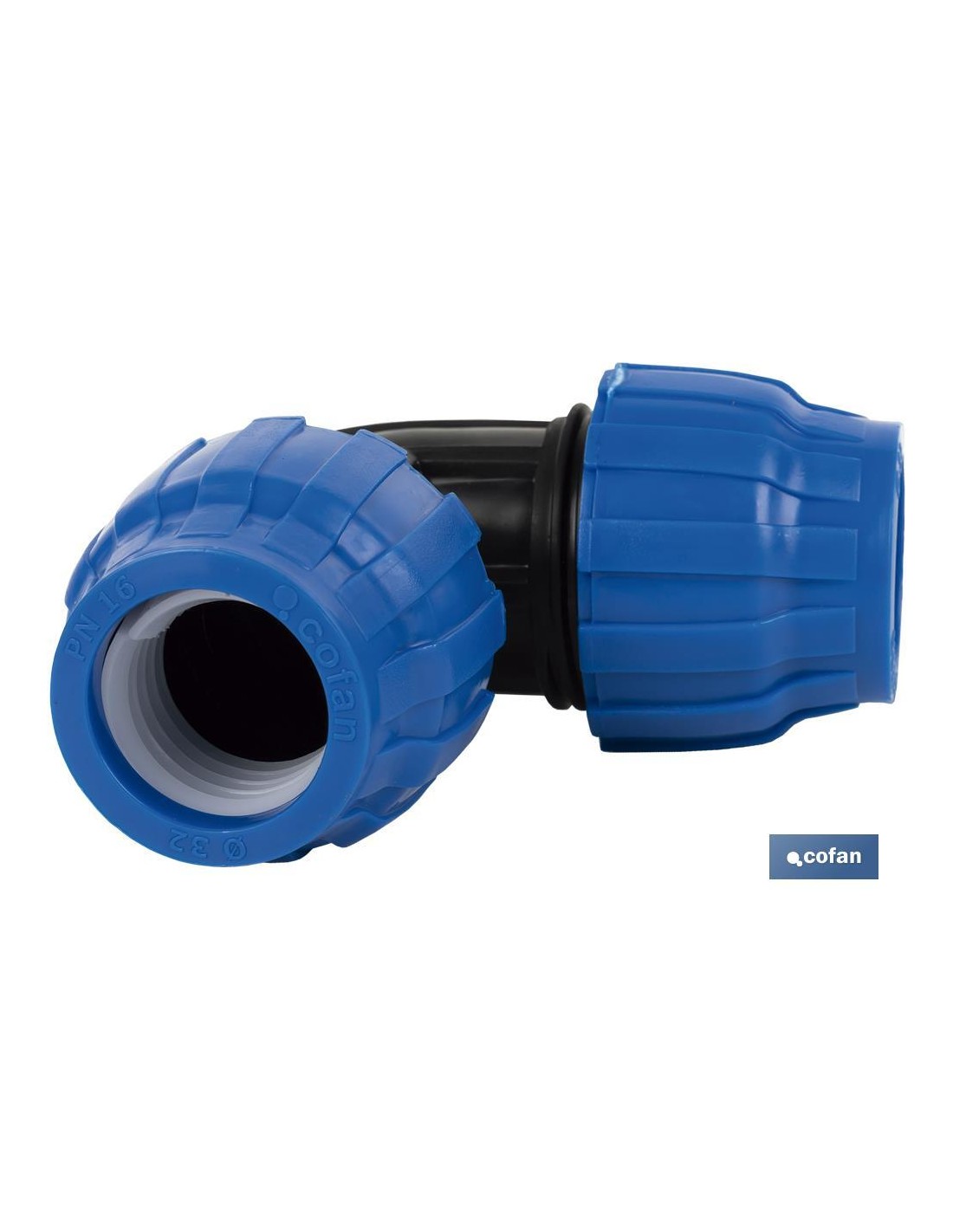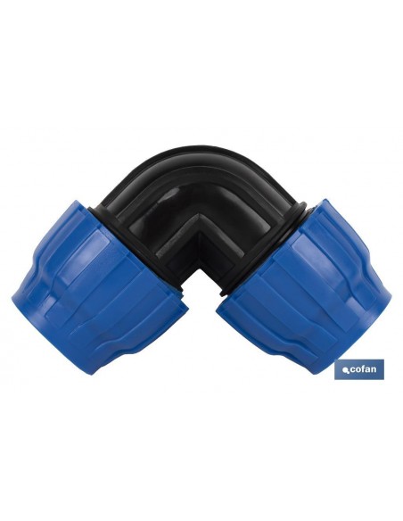 Codo 90° para tuberías de polietileno (PE).Adecuado para trabajar en sistemas de conducción de agua con una presión nominal de 16 bares. Este codo 90° está fabricado en polipropileno de alta calidad y durabilidad con un acabado de color negro y dos tuercas de color azul. Dispone de junta de estanqueidad de EPDM que garantiza un ajuste fuerte, duradero y sin fugas.Disponible con diferentes medidas. Pueden comprarse en pack o de forma unitaria.
