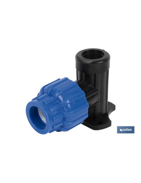 Codo 90° para grifo que incluye una conexión con tuerca azul y una rosca hembra BSP. A esta rosca hembra BSP se le puede acoplar cualquier otro enlace con rosca macho o grifo de misma métrica.Incluye una placa con 3 agujeros para poder acoplarlo a cualquier muro o poste con facilidad.Adecuado para trabajar en sistemas de conducción de agua con una presión nominal de 16 bares.Este codo está fabricado en polipropileno de alta calidad y durabilidad con un acabado de color negro y una tuerca azul.Dispone de una junta de estanqueidad de EPDM que garantiza un ajuste fuerte, duradero y sin fugas.Disponible en diferentes medidas.Puede comprarse en pack o de forma unitaria.