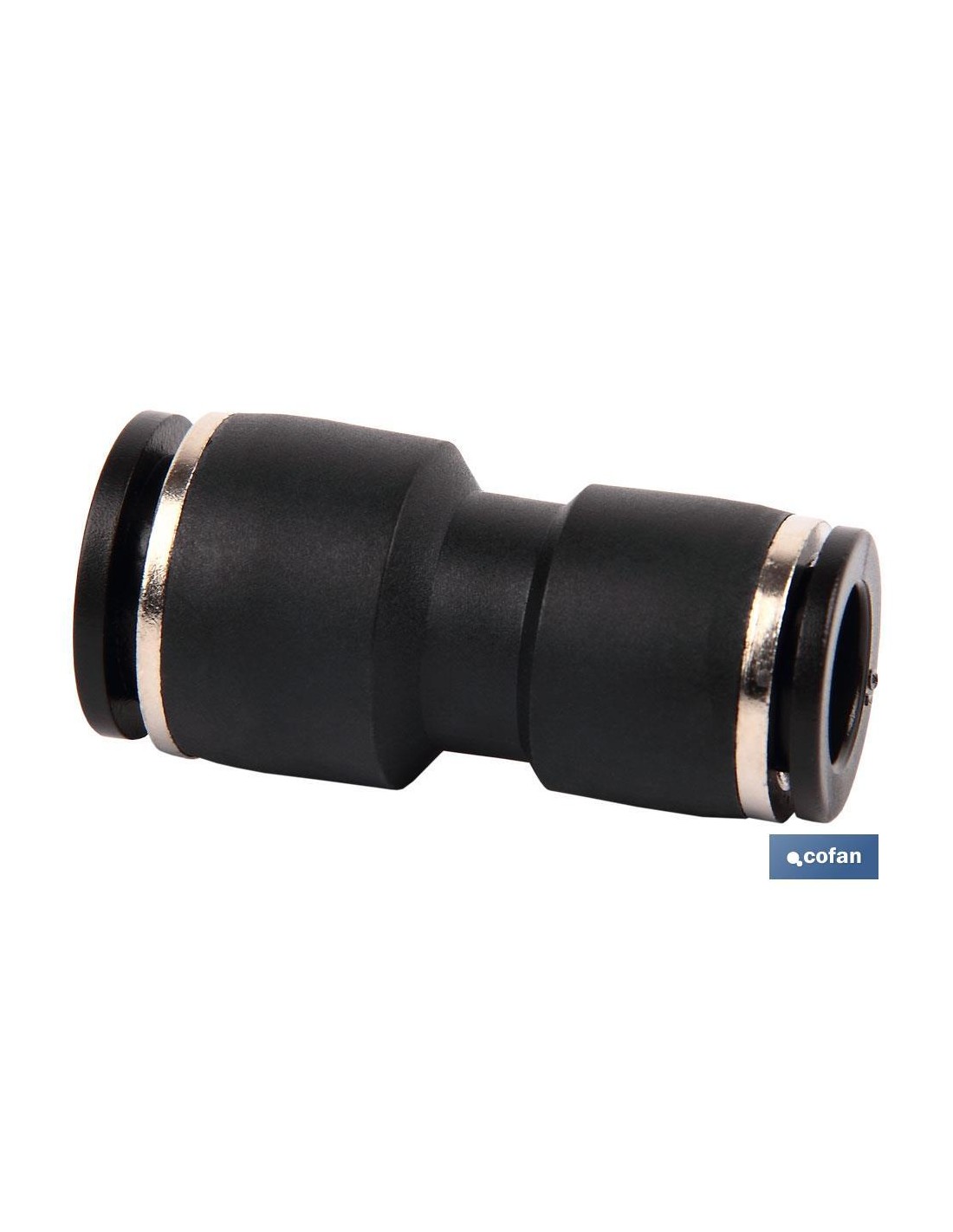 Racores enchufe rápido de reducción, totalmente en plastico, recuperables de conexión instantánea para tubos desde 4mm hasta 12mm de exterior. Adecuados para instalaciones de aire comprimido. Fácil visión del calibre de la tubería. Total seguridad y estanqueidad, incluso en condiciones límite.