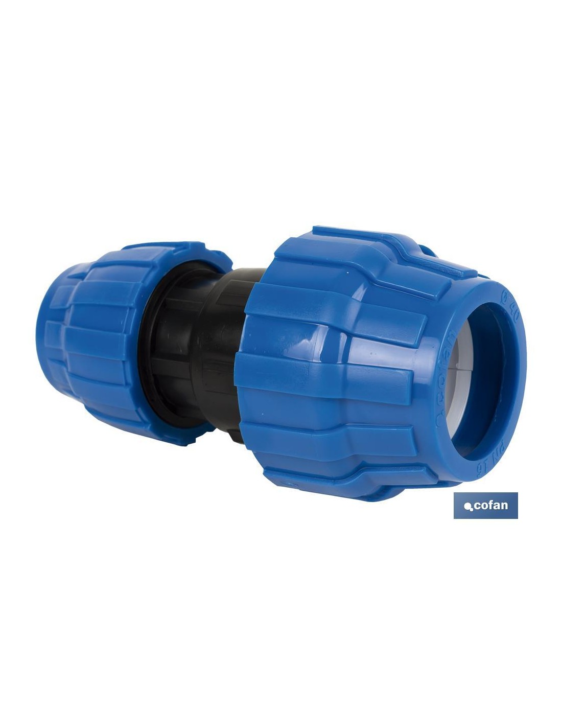 Enlace reducido con dos conexiones de diferente medida para tuberías de polietileno (PE).Adecuado para trabajar en sistemas de conducción de agua con una presión nominal de 16 bares. Este enlace está fabricado en polipropileno de alta calidad y durabilidad con un acabado de color negro y dos tuercas de color azul. Dispone de junta de estanqueidad de EPDM que garantiza un ajuste fuerte, duradero y sin fugas.Disponible en diferentes medidas. Puede comprarse en pack o de forma unitaria.