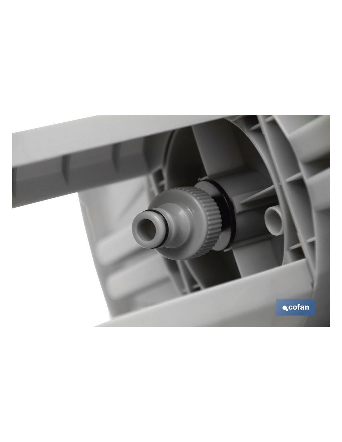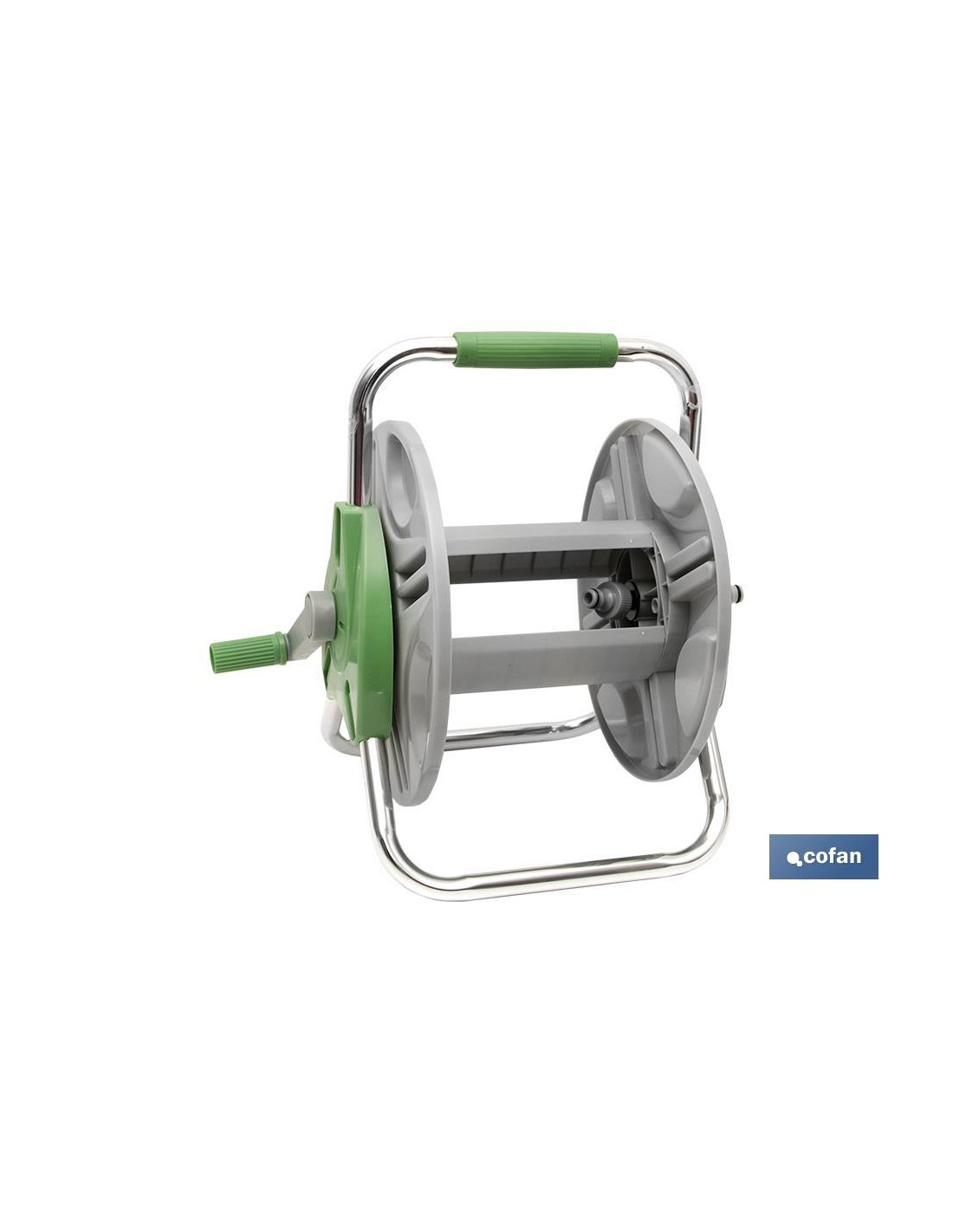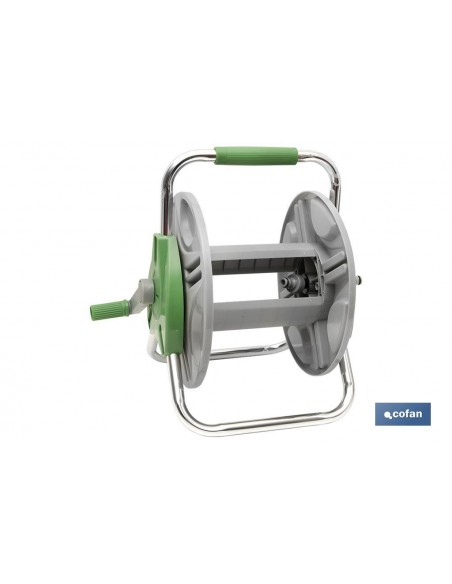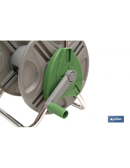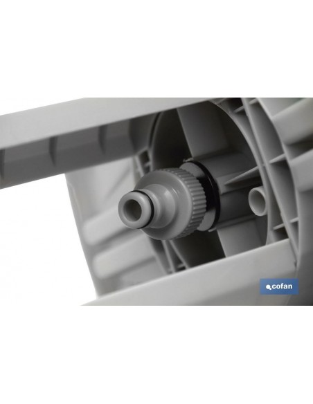 Enrollador de manguera con enchufes rápidos en su interior. El enrollador de manguera es fácil y cómodo de transportar por todo tu jardín. Llévalo contigo a donde vayas, el diseño compacto del carrete y el asa de transporte lo hace fácil de levantar y transportar. Como la conexión de la manguera está acodada en el carro portamanguera, la manguera no se puede doblar y el agua fluye siempre libremente. Una vez cerrado el paso del agua, usted puede conectar la manguera al dispositivo antigoteo integrado. No se derrama ni se malgasta agua durante su transporte ni después del uso.