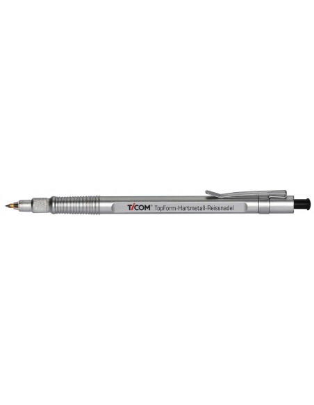 Cuerpo ergonómico plástico color plata con clip. Punta de metal duro intercambiable accionada por pulsador. Marca metales con durezas de hasta 60 HRC. Presentado en funda de plástico.