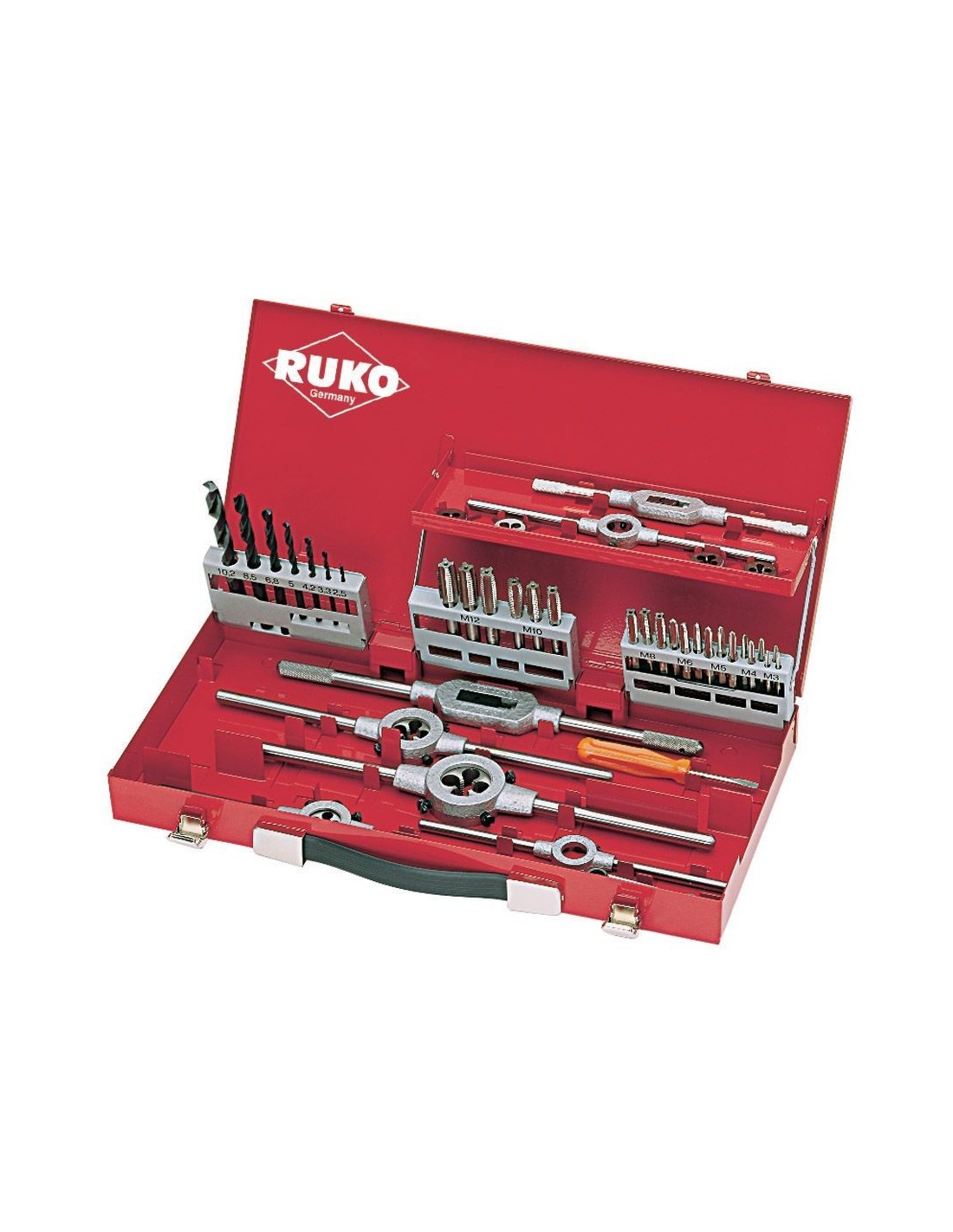 Compuesto por 21 machos M DIN 352 HSS rectificados, 3 piezas de cada: M 3 - M 4 - M 5 - M 6 - M 8 - M 10 - M 12