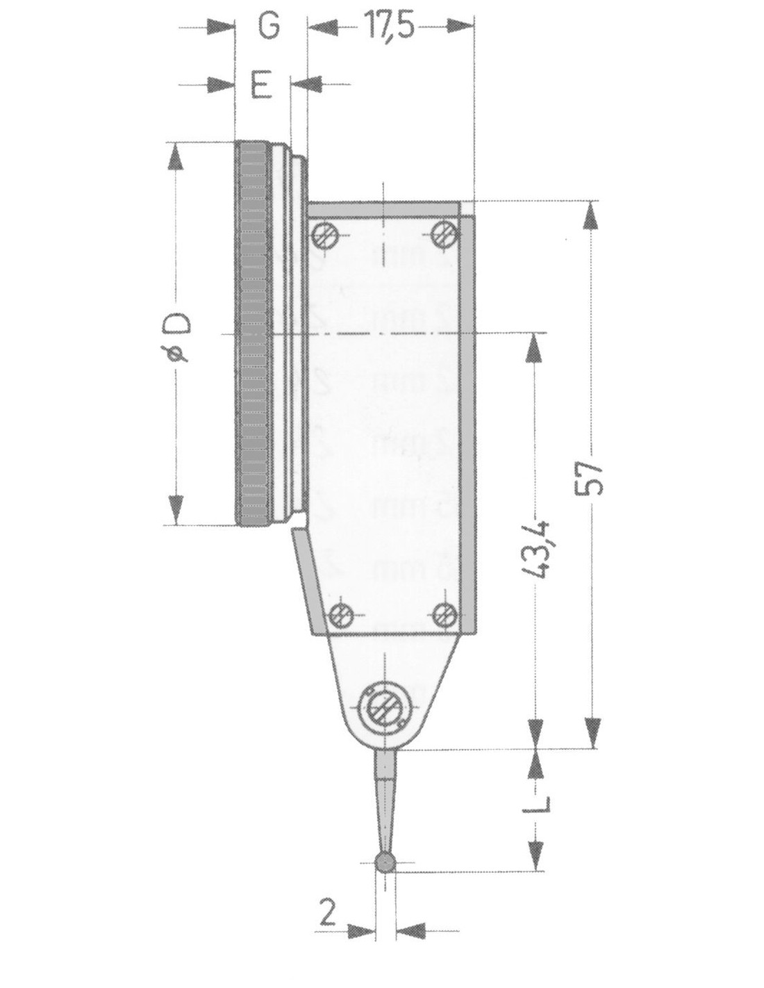 | Referencia | Capacidad (mm) | Alcance (mm) | Lectura (mm) | Ø D (mm) | E (mm) | G (mm) | Longitud punta palpador (mm) | Peso (g) |