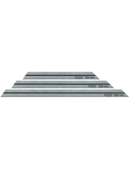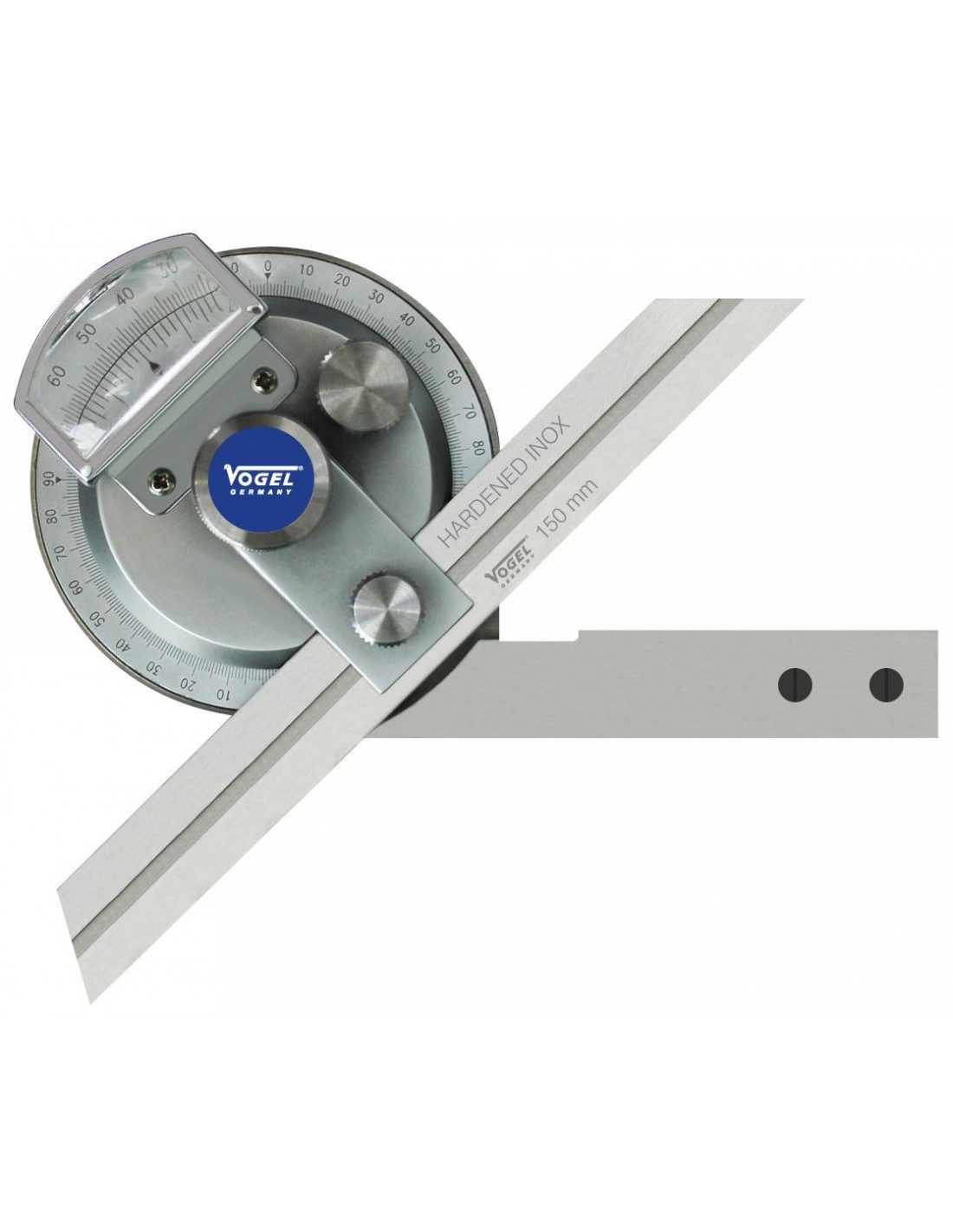 Con 3 láminas de diferentes largos. Acero inoxidable, templado y finamente pulido. Escala cromado mate, graduada en 1/12º = 5" sin error de paralelaje. Tornillo de ajuste, lupa de aumento, escuadra regulable. Estuche de plástico.