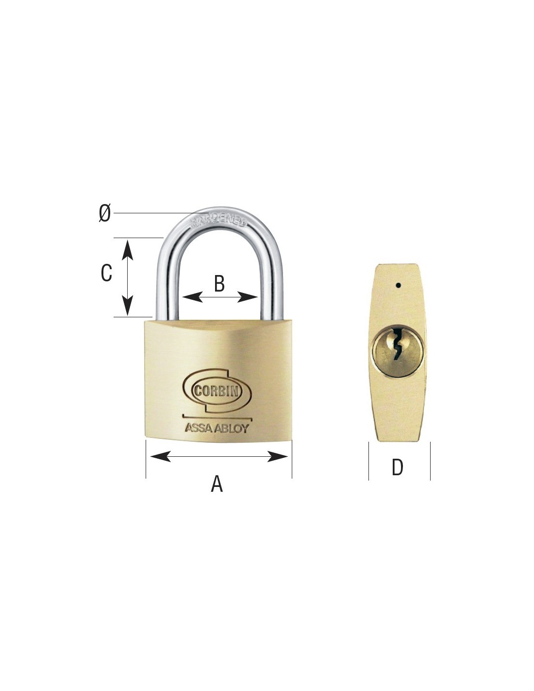 | Referencia | A - Ancho del candado (mm) | Ø arco (mm) | B - Ancho del arco (mm) | C - Alto del arco (mm) | D - Grosor del candado (mm) |