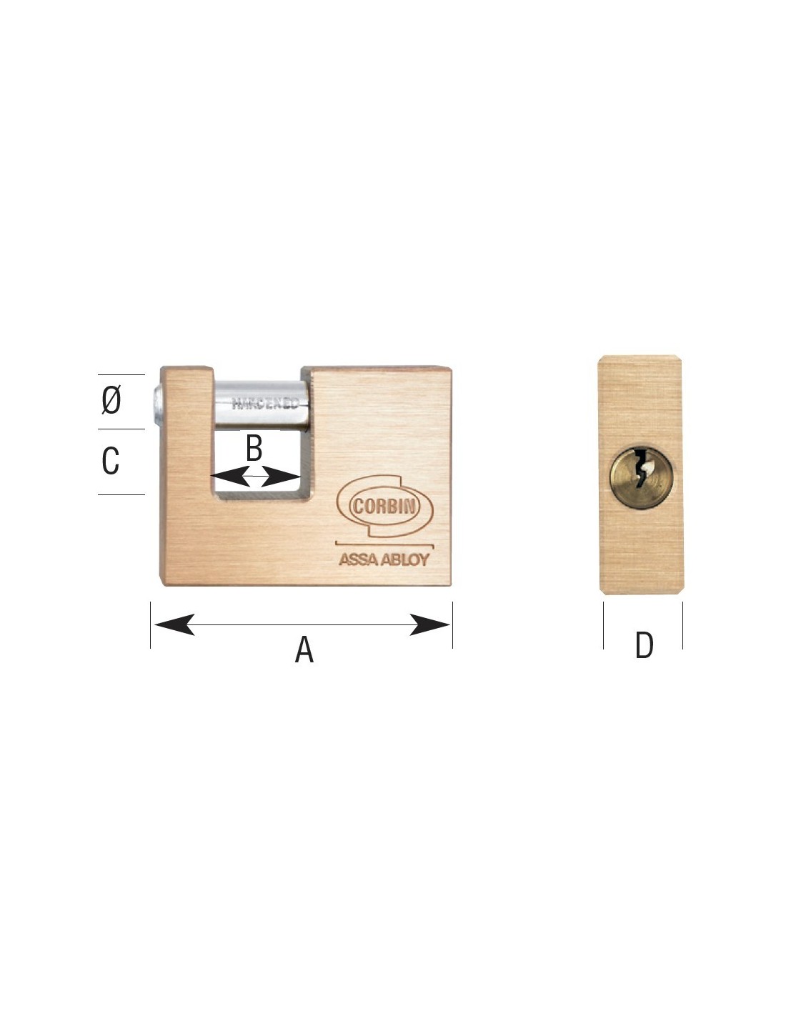 | Referencia | A - Ancho del candado (mm) | Ø arco (mm) | B - Ancho del arco (mm) | C - Alto del arco (mm) | D - Grosor del candado (mm) |