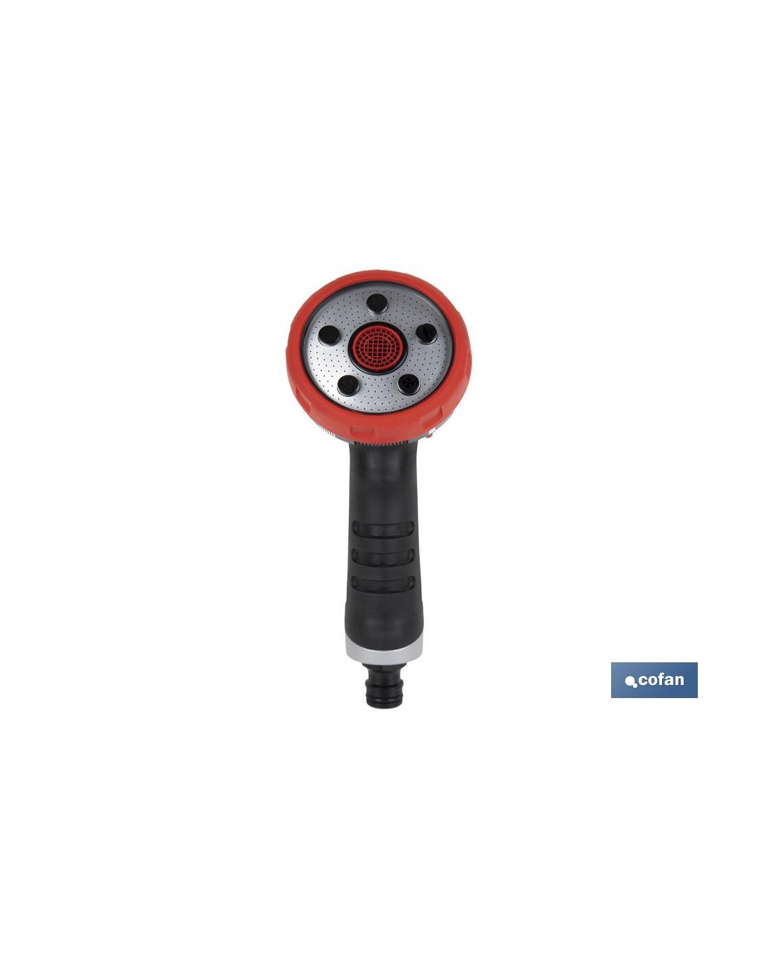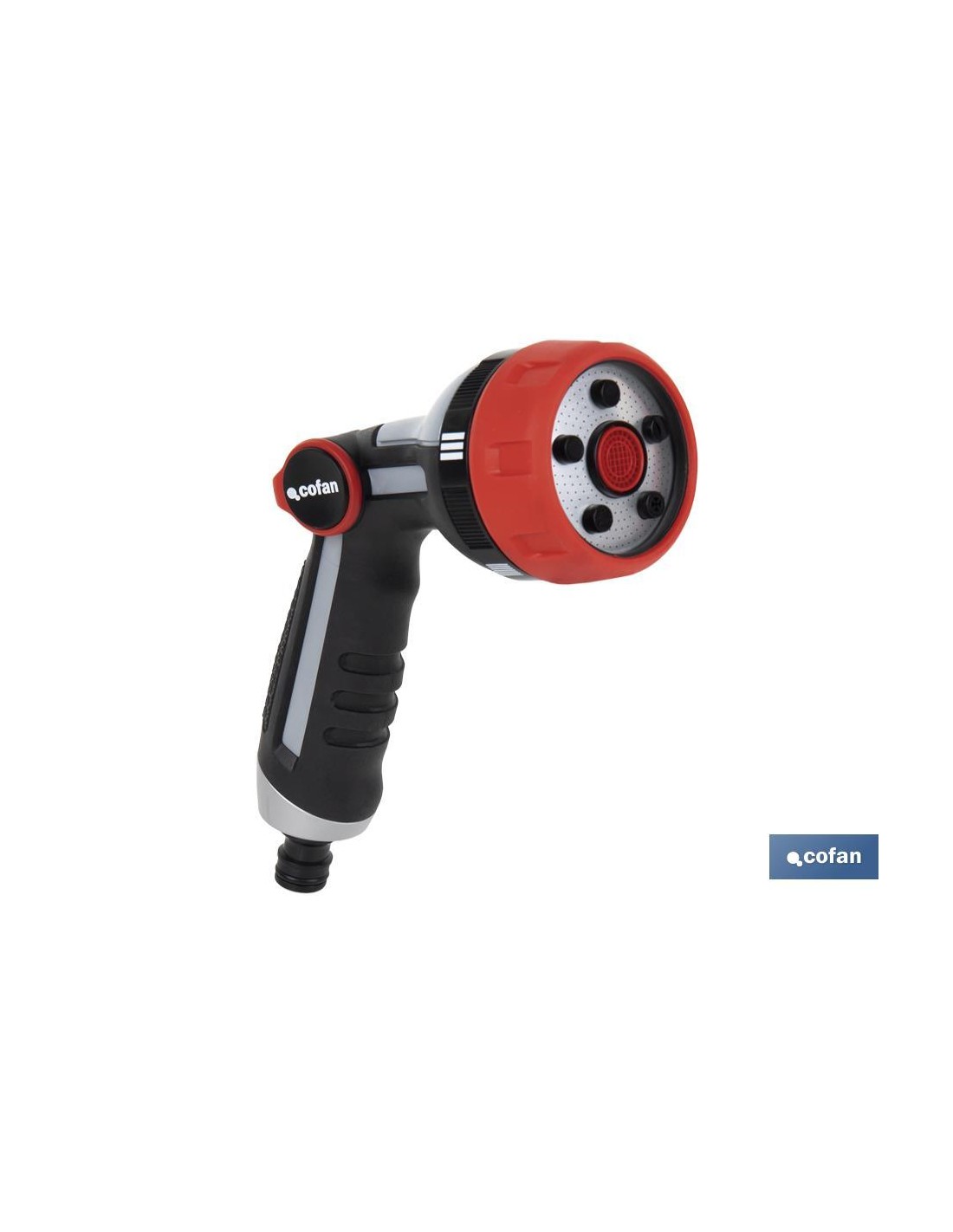 Pistola de riego con control de caudal y varias funciones de riego. Indicada para jardines, patios y terrazas. También puedes usarla para lavar el coche o a tu mascota. Puedes regular el caudal del agua de forma sencilla y segura cómodamente con el pulgar. Es ultraligera y su mango ergonómico tiene un agarre cómodo y seguro. Con 5 modos: chorro concentrado, chorro a presión, chorro plano horizontal, neblina depulverización y ducha.