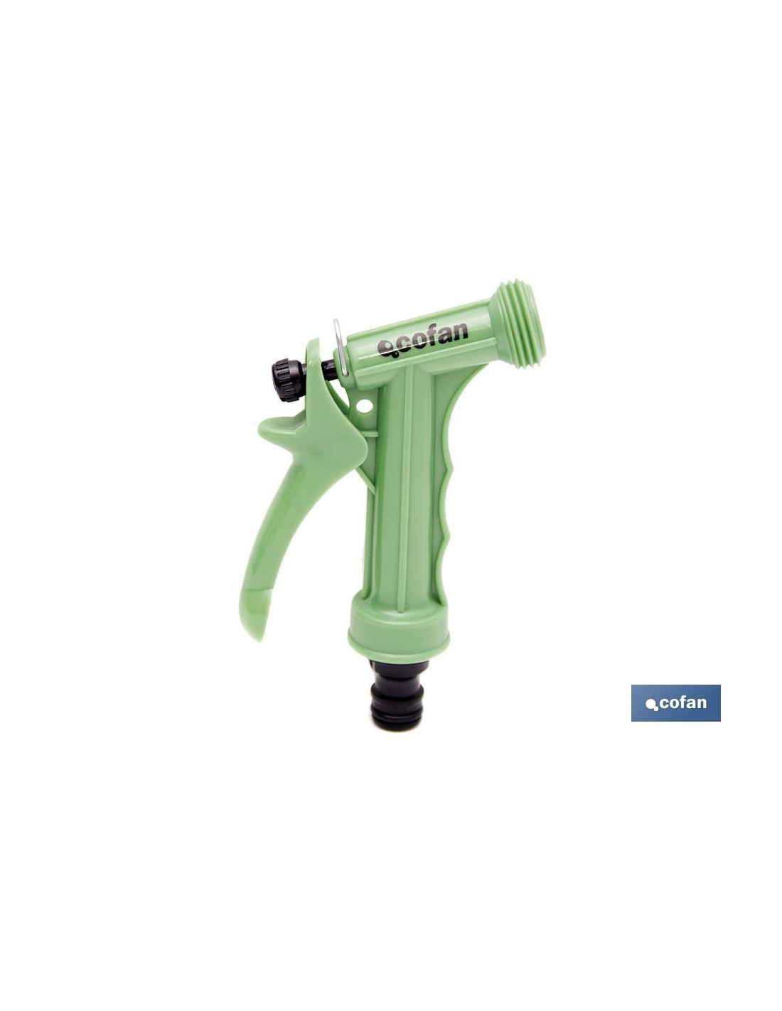 Pistola de riego para jardín. Su extremo es biselado para el acople de accesorios. La palanca es de fibra de vidrio reforzada. Esta pistola de riego se puede usar para regar plantas o céspedes, limpiar mascotas, ventanas, terrazas u otro tipo de objetos. La pistola tiene un diseño de palanca muy cómodo, adecuado a la estructura de la mano. En comparación con las pistolas de metal, el plástico no se oxida y tiene una vida útil más larga. La pistola de riego es de muy buena calidad, está fabricada con plástico ABS. Es muy ligera y cómoda para utilizar en cualquier lugar.