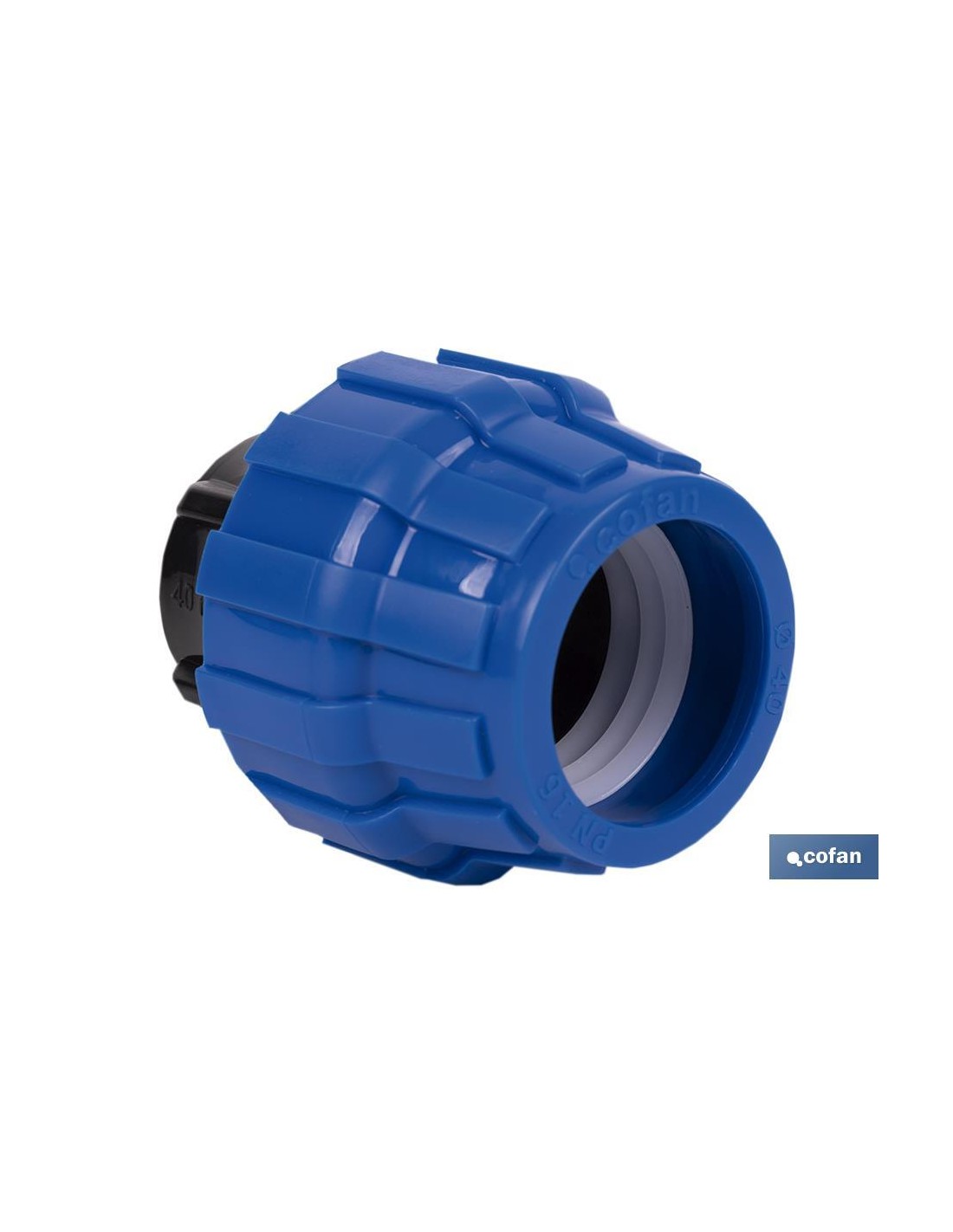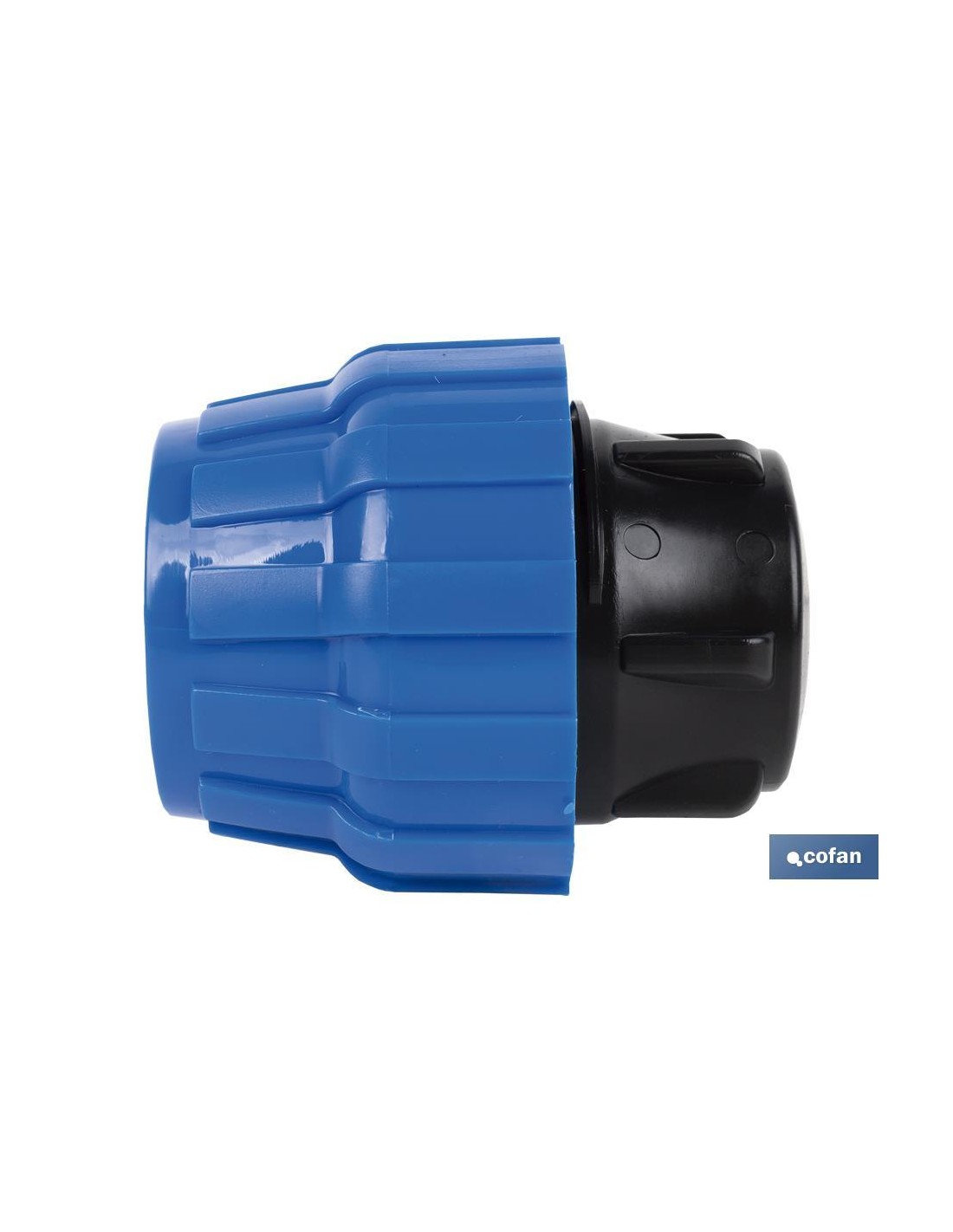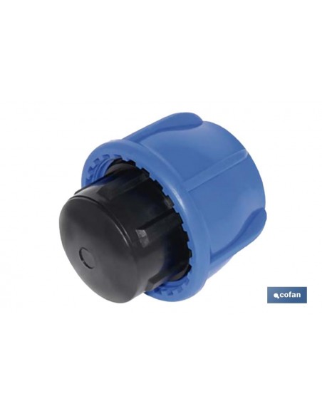 Tapón final para tuberías de polietileno (PE).Adecuado para trabajar en sistemas de conducción de agua con una presión nominal de 16 bares.Este enlace está fabricado en polipropileno de alta calidad y durabilidad con un acabado de color negro y una tuerca de color azul. Dispone de junta de estanqueidad de EPDM que garantiza un ajuste fuerte, duradero y sin fugas.Disponible con diferentes medidas. Pueden comprarse en pack o de forma unitaria.
