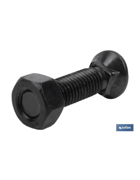 Tornillo cultivador de cabeza ovalada bombeada y cuello cuadrado principalmente utilizado para el sector agrícola. Ideal para cultivadores. Se trata de un tornillo de calidad 8.8 con acabado pavonado. Incluye una tuerca hexagonal DIN 934 de calidad 8. El tornillo se suministra en cajas de 50 unidades.