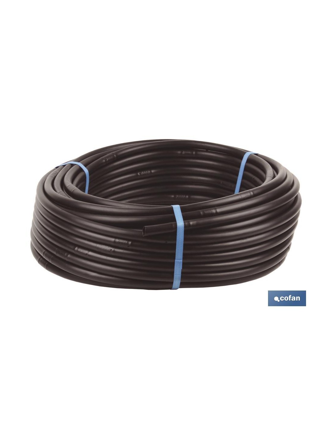 Tubo de riego por goteo de color negro con goteros incluidos. Disponible en diferentes medidas que se adaptan a las necesidades más exigentes. Fabricado en material resistente a las condiciones climaticas más adversas. Puedes complementarlo con distintas conexiones y accesorios para riego por goteo de Cofan.