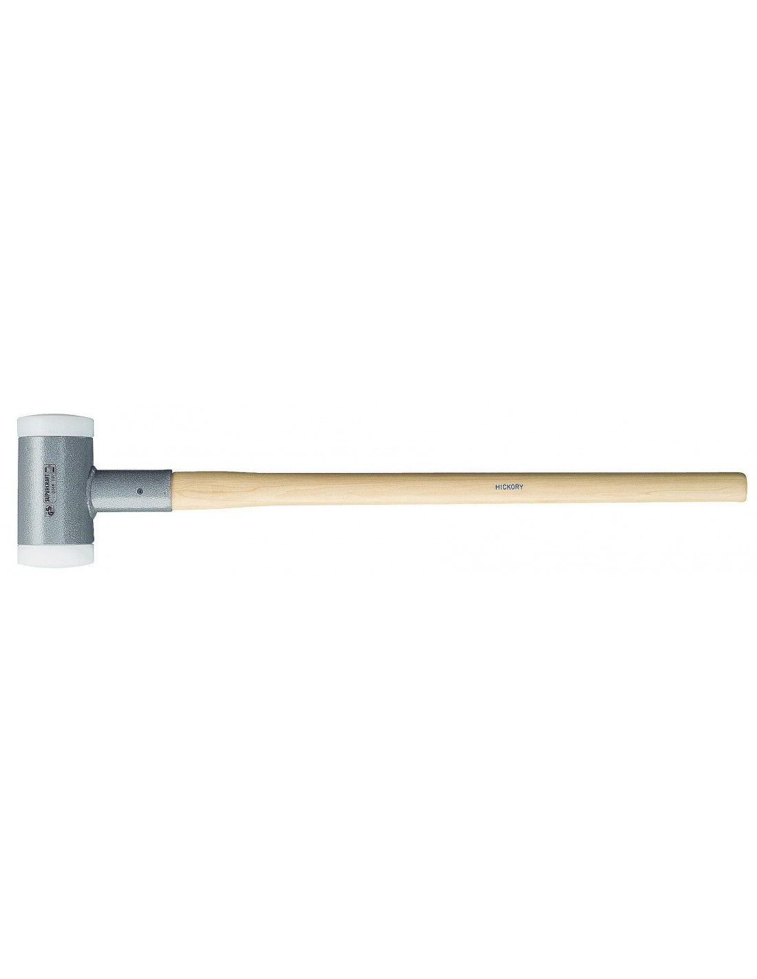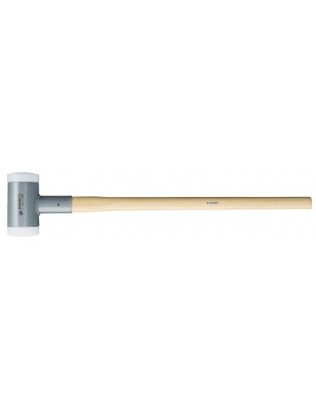 Mallo anti-rebote con cabeza rellena de bolas de acero para una reducción de la vibración y una transmisión total de la fuerza de impacto, cuerpo totalmente soldado por robot y pintado epoxi, mango ergonómico de madera Hickory barnizada, manguito protector del mango, conexión segura entre el cuerpo y el mango mediante cuña de aluminio y pasador, y bocas de nylon de excelente resistencia al impacto y de larga duración. Las bocas y el mango son reemplazables.