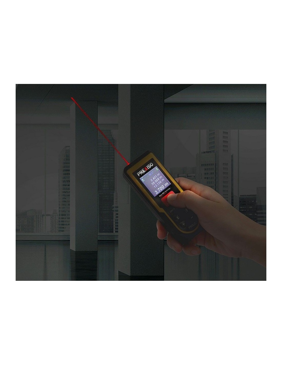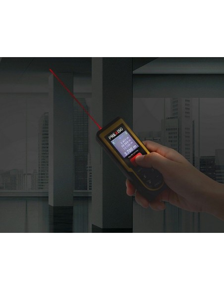 Medidor láser con cálculo automático de áreas y volúmenes, sistema de medidas multifunción (área, volumen, distancia, longitud, pitágoras, suma y resta), medición continua, niveles de burbuja digital para una medición más precisa, y pantalla LCD retroiluminada en color.
