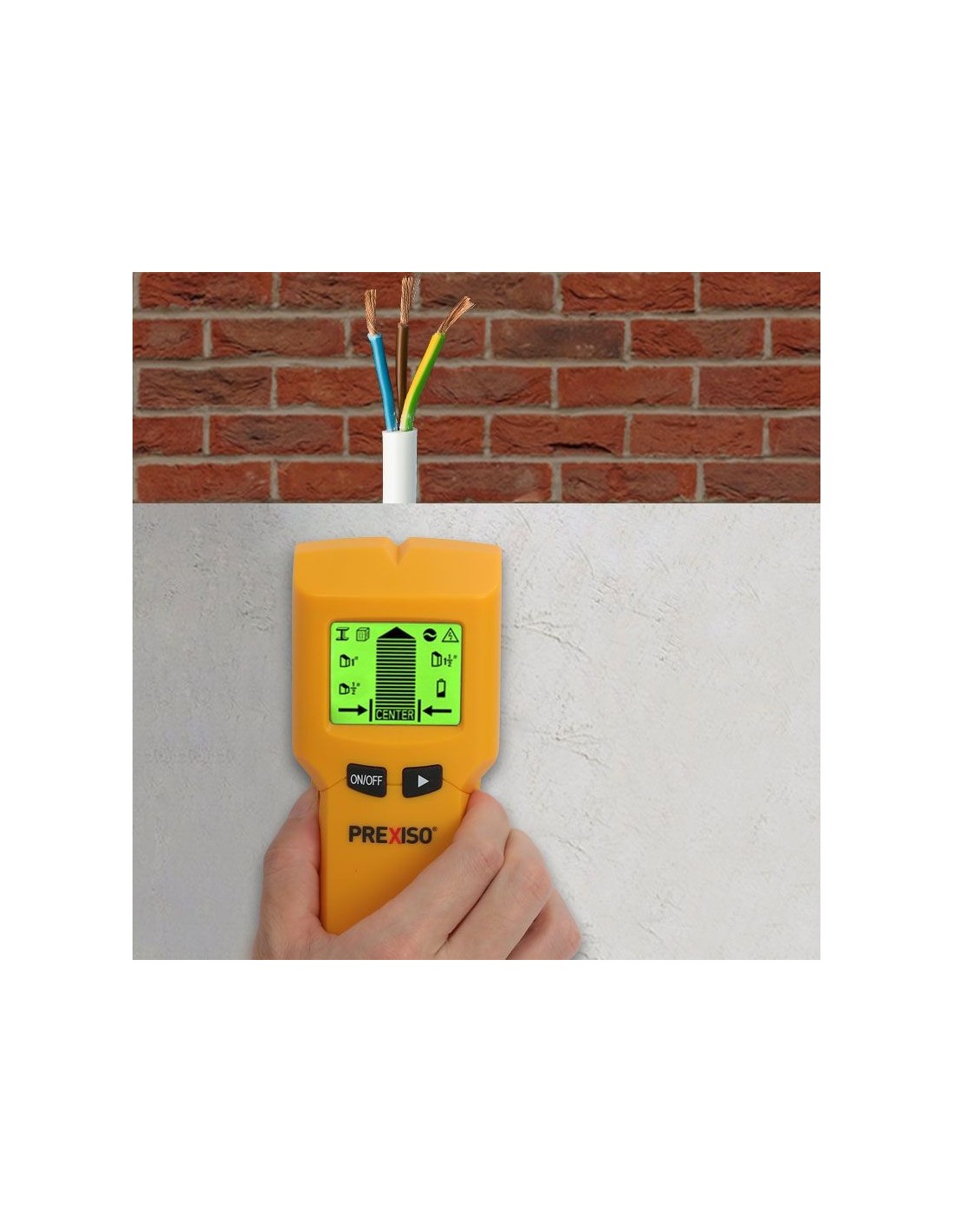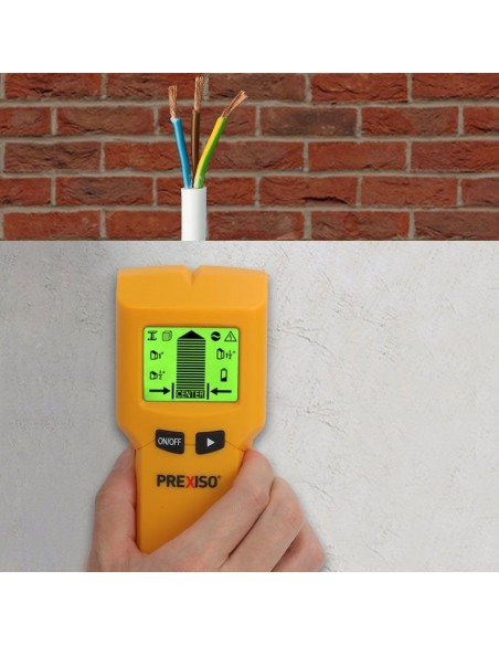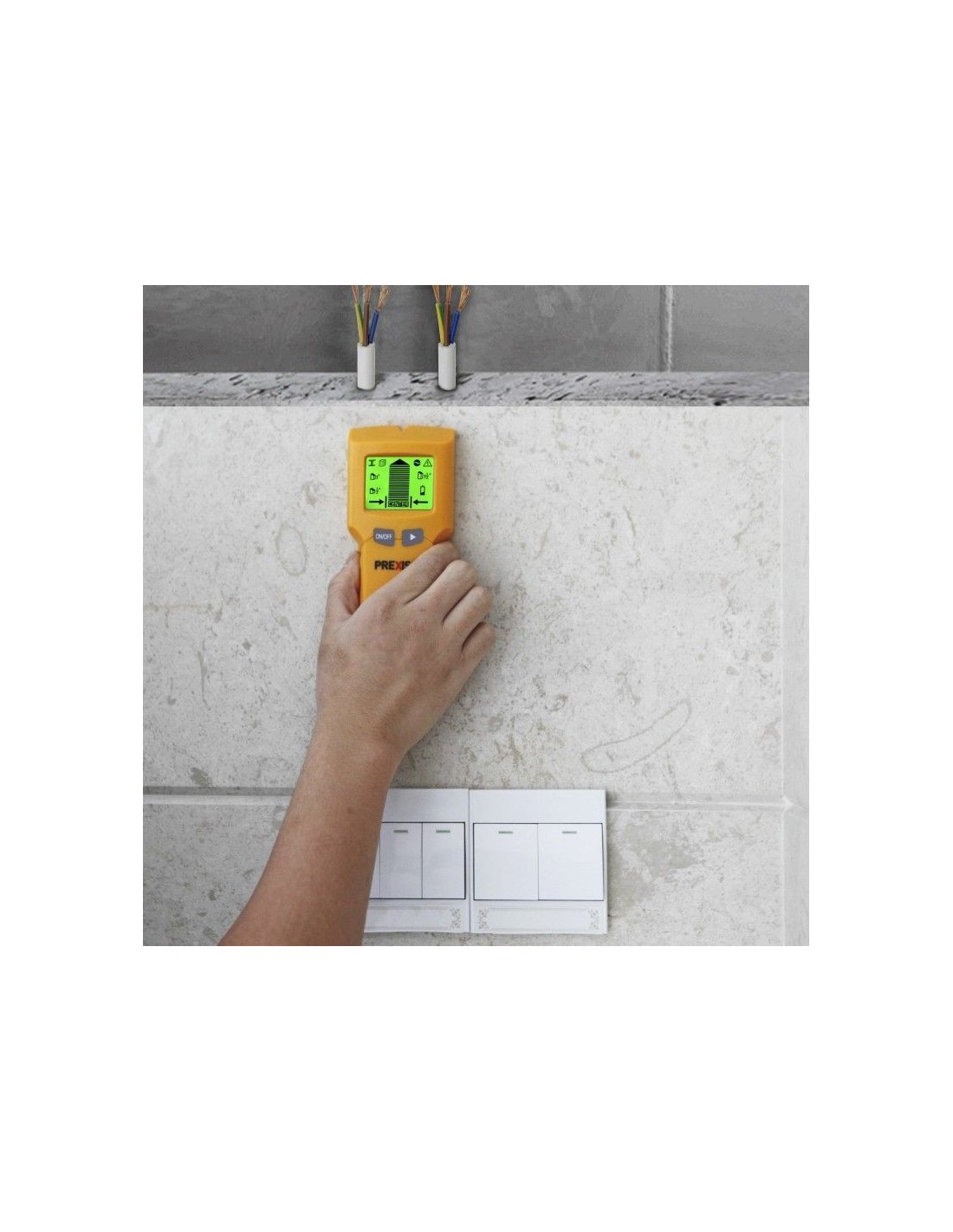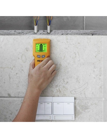 Detector múltiple que permite localizar tanto barras de madera y metal, como cableado eléctrico en paredes, techos y suelos. La pantalla LCD y la indicación de audio proporcionan información sobre la posición de la línea de alimentación. Alimentado por una batería de 9V (No incluida).