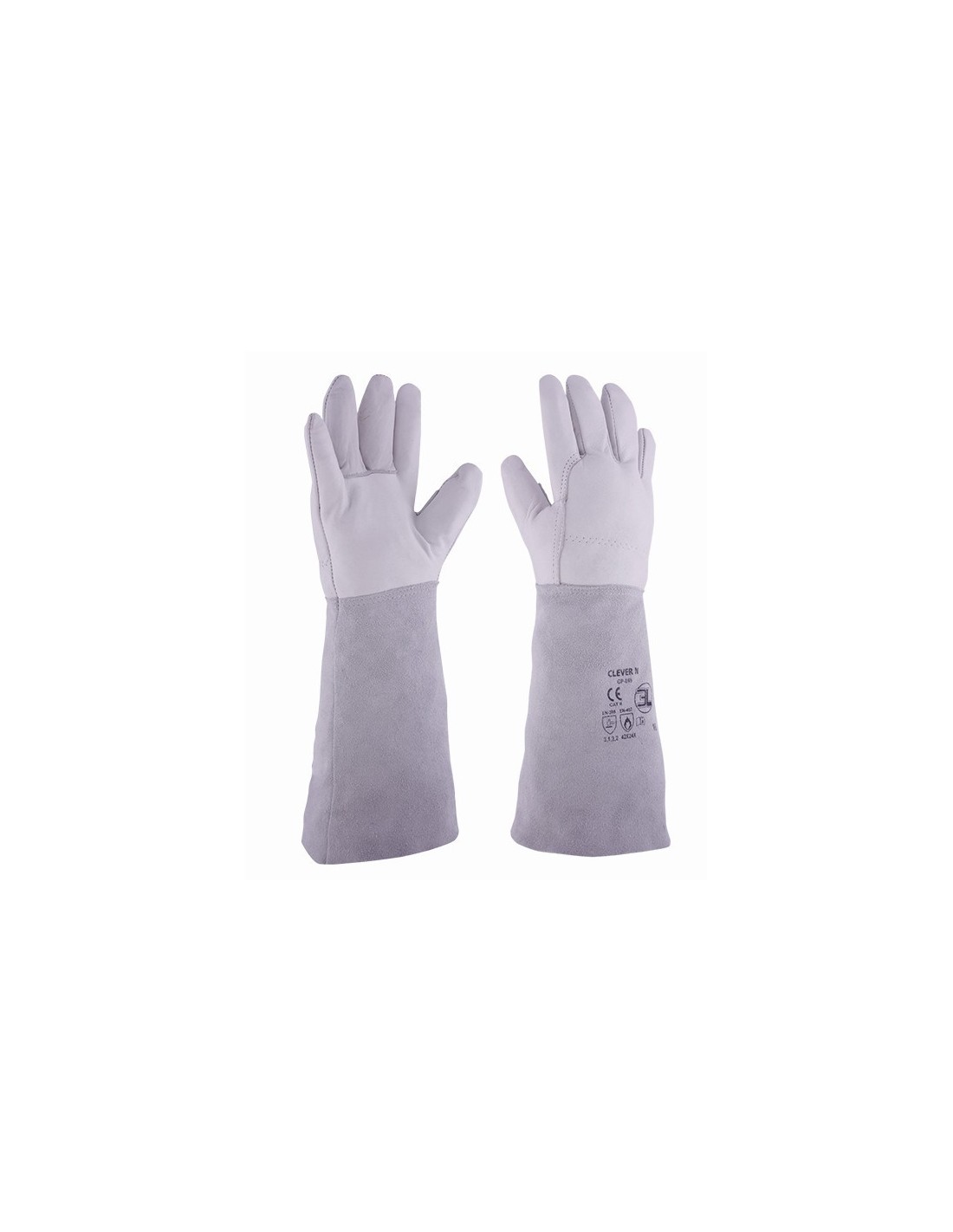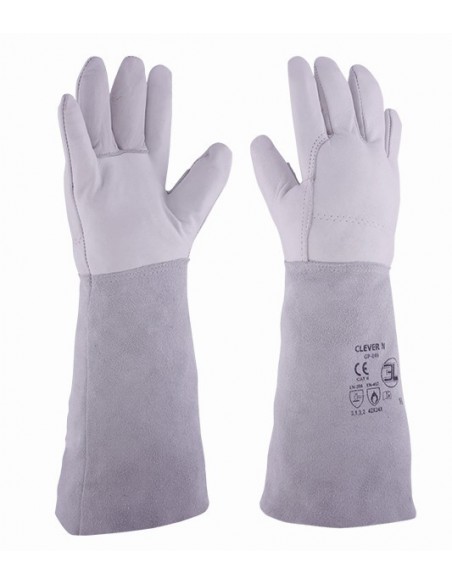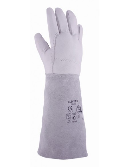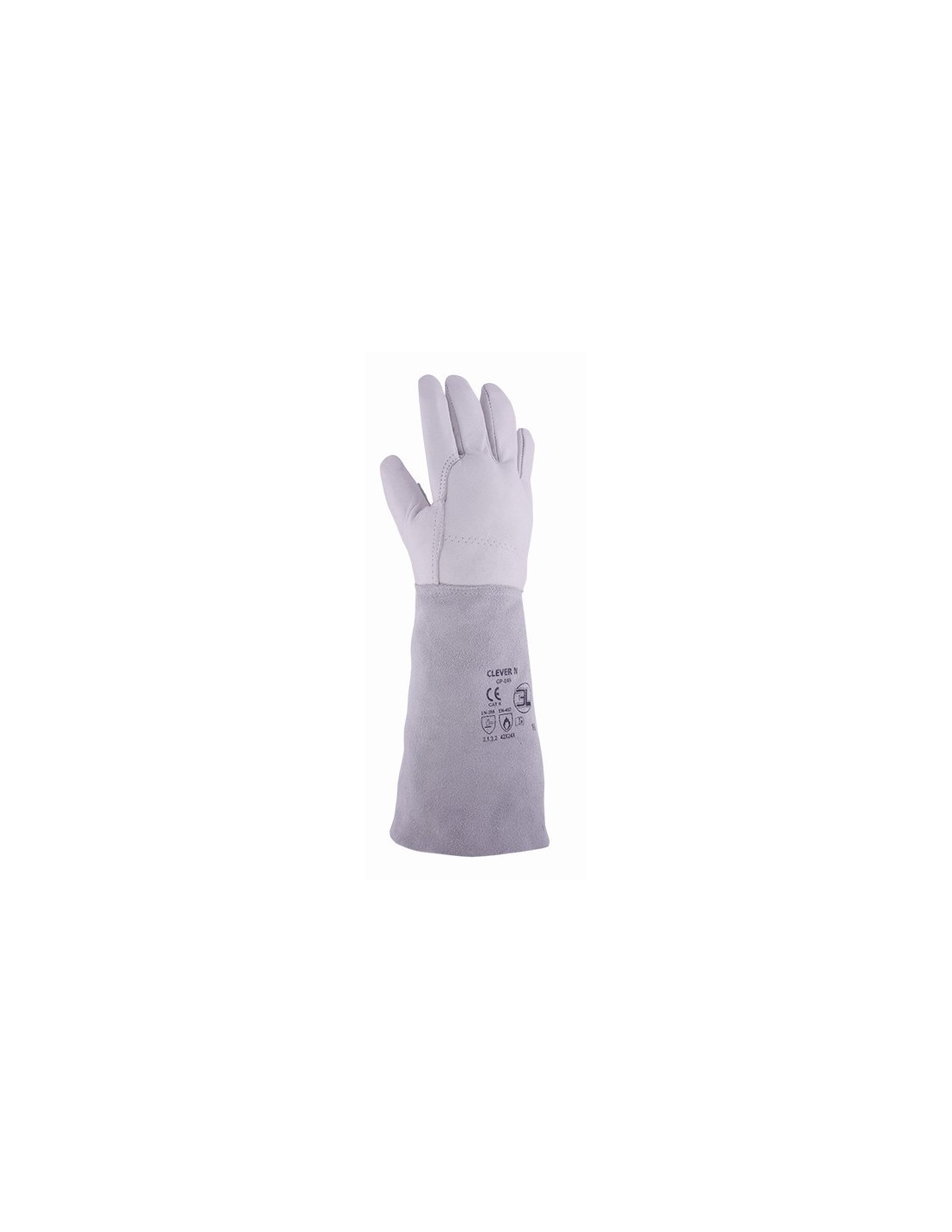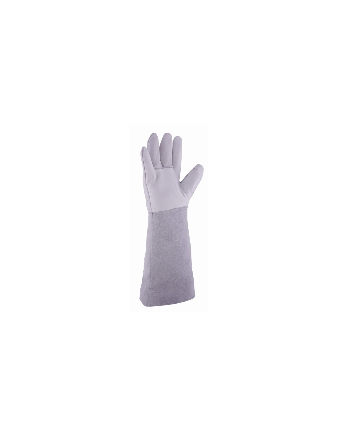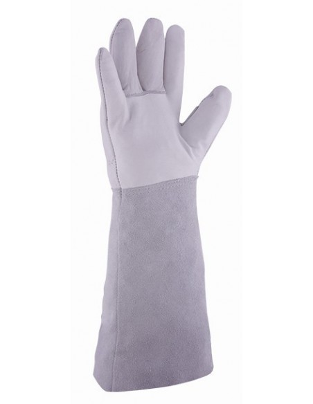 Guante en piel flor vacuno en color blanco/gris con grueso de 0,7 mm. a 0,8 mm. y manga de serraje de 180 mm de longitud.
