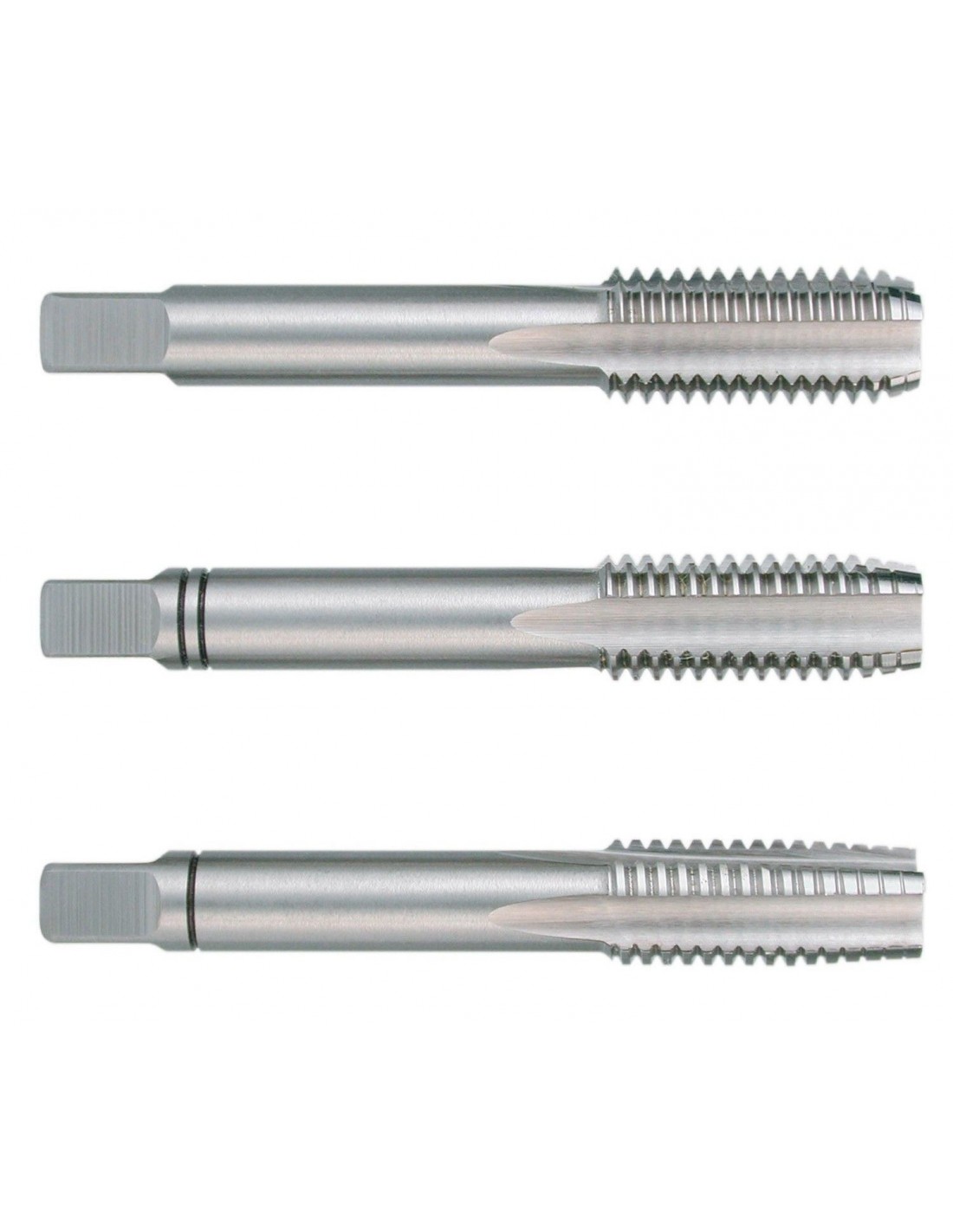 Para roscas pasantes y roscas de agujero ciego en aceros no aleados y aceros de baja aleación hasta una resistencia de 800 N/mm², fundición maleable y metales no-férricos. La rosca se terraja en 3 pasos. Juegos de 3 piezas: desbaste, intermedio y acabado. Rosca: métrica DIN ISO 13. Tolerancia: ISO 2 / 6H. Superficie brillante. Corte a la izquierda.