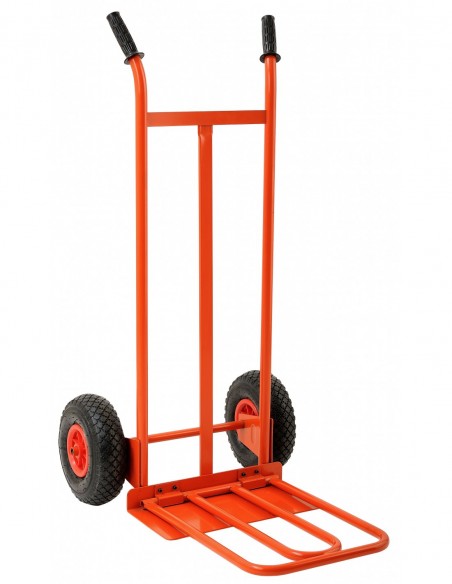 Carretilla fabricada en acero, con pala abatible, y asas antideslizantes. Provisto de ruedas neumáticas con clips para montaje y desmontaje rápido. Carga máxima de 200 kg.